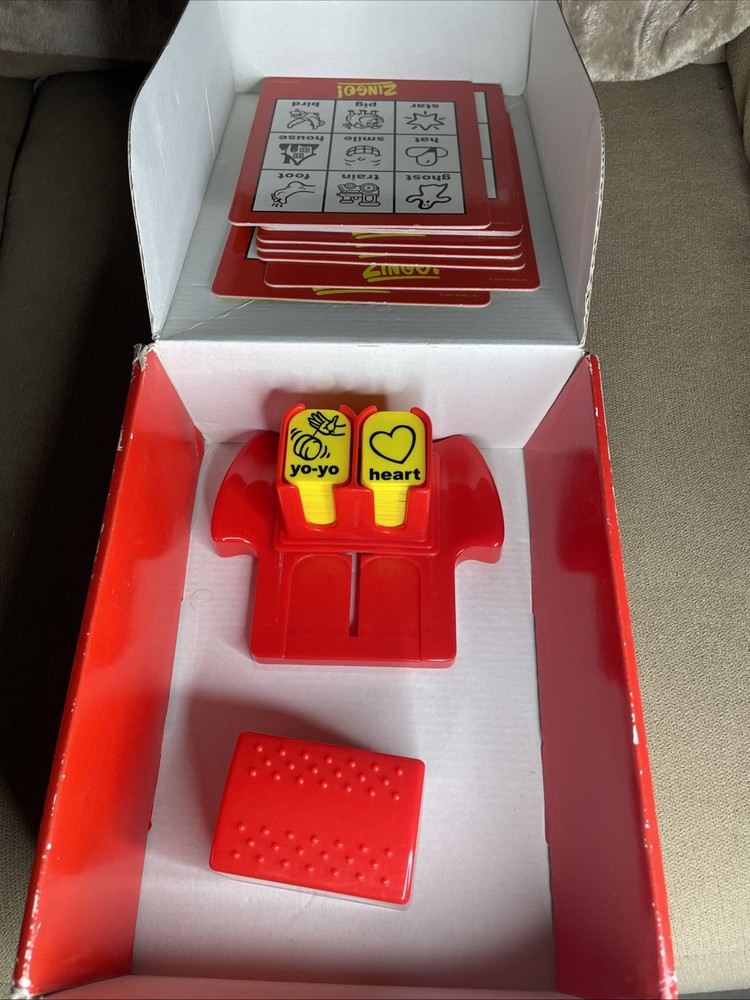The ThinkFun Zingo! Bingo game is a fun learning activity for kids aged 4 and up. This first edition from 2002 features picture tiles and cards in red and yellow colors. The plastic game set includes various subjects to engage young learners and is suitable for ages 4 to 16. Made in China, this game provides an interactive and educational experience for children.