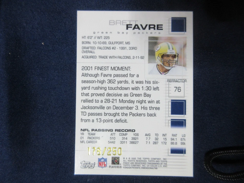 2002 Topps Finest Refractor Brett Favre Game Jersey /250 Green Bay Packers See photos for condition. Shipped in one touch in bubble mailer. Free standard shipping. Domestic only. No international shipping. No returns.