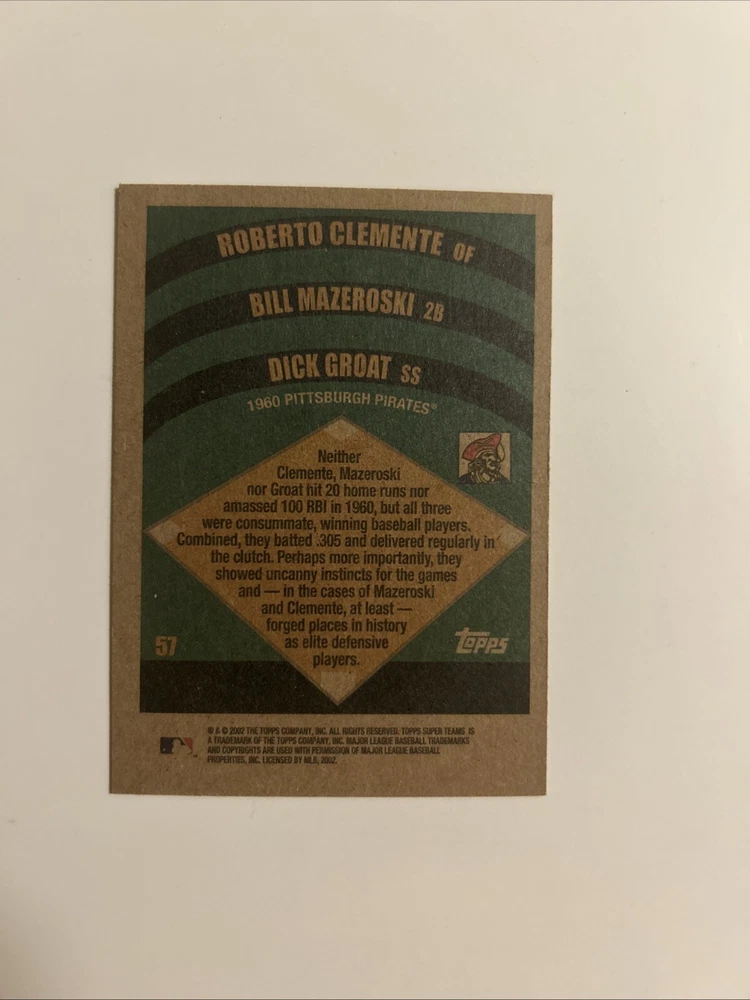 The product is a 2002 Topps Super Teams trading card featuring the 1960 Pittsburgh Pirates team. The card includes players such as Bill Mazeroski, Roberto Clemente, and Dick Groat. It is card number 57 in the set and is autographed by Mazeroski, with a special autograph variation marked as "#6." This collectible item is a part of the Sports Trading Cards category and would be a valuable addition for fans of the Pittsburgh Pirates or collectors of baseball memorabilia.