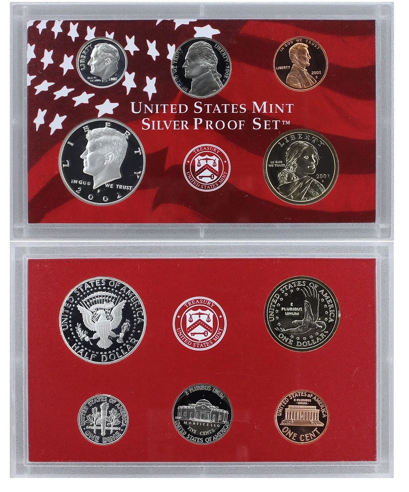 2002 United States Mint Silver Proof Set - 10 Coins - COA & OGP 90% Silver This 2002 U.S. Mint Silver Proof Set contains 10 proof condition silver coins. This 2002 Silver Proof set contains the Lincoln Cent, Jefferson Nickel, Roosevelt Dime, Kennedy Half-Dollar, Sacagawea Dollar and all five of the Washington Quarters minted for the 50 State Quarters Program in 2002. The 5 state quarters include Tennessee, Ohio, Louisiana, Indiana, and Mississippi and are minted in 90% silver, as are the dime, quarter, and half dollar. All 5 state quarters share the same Washington obverse. This 2002 U.S. Mint Silver Proof set comes in like new condition, sealed in two plastic display cases as packaged by the U.S. Mint, and includes the original Mint packaging box and Certificate of Authenticity.