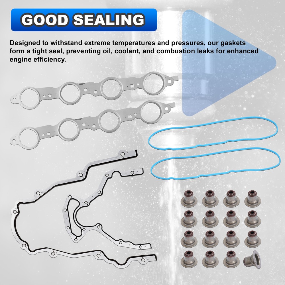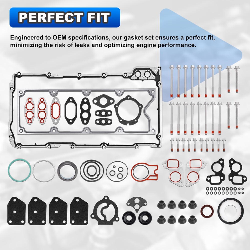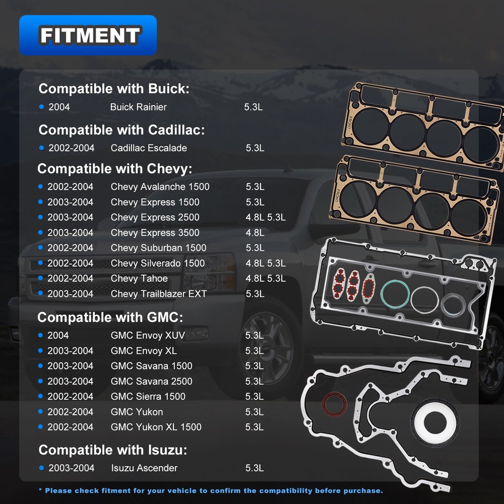 Head Gasket Set w/Bolts For 2002-2011 Chevy GMC Buick Cadillac 4.8L 5.3L ES72173 Product Description FITMENT1: Full head gasket compatible with Chevy: 2002-2004 Avalanche 1500 5.3L | 2002-2004 Suburban 1500 5.3L | 2002-2004 Silverado 1500 4.8L 5.3L | 2002-2011 Tahoe 4.8L 5.3L | 2003-2004 Trailblazer EXT 5.3L | 2003-2004 Express 1500 5.3L | 2003-2004 Express 2500 4.8L 5.3L | 2003-2004 Express 3500 4.8L. Compatible with 2004 Buick Rainier 5.3L FITMENT2: Full head gasket compatible with GMC: 2003-2004 Envoy XUV, XL 5.3L | 2003-2004 Savana 1500 5.3L | 2003-2004 Savana 2500 4.8L 5.3L | 2002-2004 Sierra 1500 4.8L 5.3L | 2002-2004 Yukon 4.8L 5.3L | 2002-2004 Yukon XL 1500 5.3L. Compatible with 2003-2004 Isuzu Ascender 5.3L, 2002-2004 Cadillac Escalade 5.3L GOOD SEALING: Designed to withstand extreme temperatures and pressures, our gaskets form a tight seal, preventing oil, coolant and combustion leaks for enhanced engine efficiency PERFECT FIT: Engineered to OEM specifications, our gasket set ensures a perfect fit, minimizing the risk of leaks and optimizing engine performance PACKAGE INCLUDES: Full engine head gasket set includes multiple layers steel head gaskets, 30pcs ES72173 cylinder head bolts, rear crankshaft gasket seals, engine oil pan gasket, valley cover gasket, exhaust & Intake manifold gaskets, knock sensor grommets, damping plug heads, Valve stem seals, fiber base plates, other o-rings and gaskets Note: 1.We provide clear pictures, measurements where possible. Please check as much as possible to make sure the item is the one that you need. 2.Please allow 1-10mm deviation due to manual measurement. 3.Due to light and screen difference, the item's color may be slightly different from the pictures. 4.make sure that the size and shape of the product matches your car. 5.No installation guides are included, we highly recommend to seek professional installation. Any damage during installation will not be refunded.