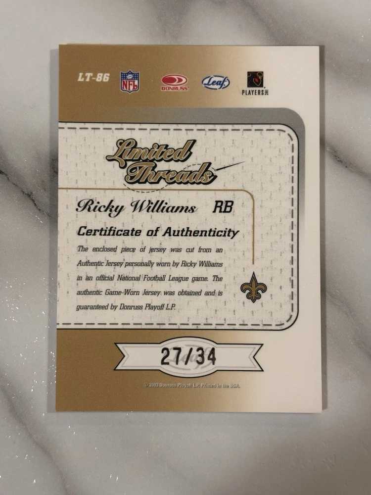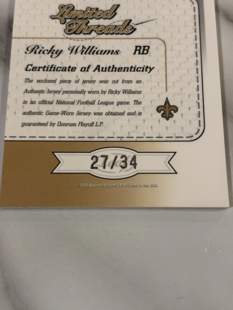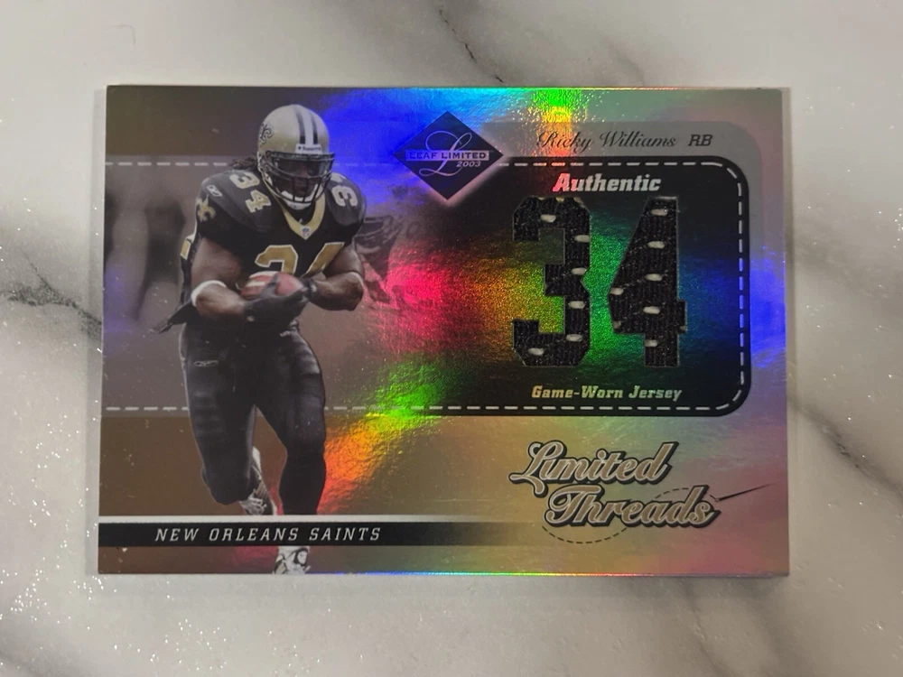 2003 Donruss Playoff Ricky Williams Limited Threads Jersey Match /34, Rare Find