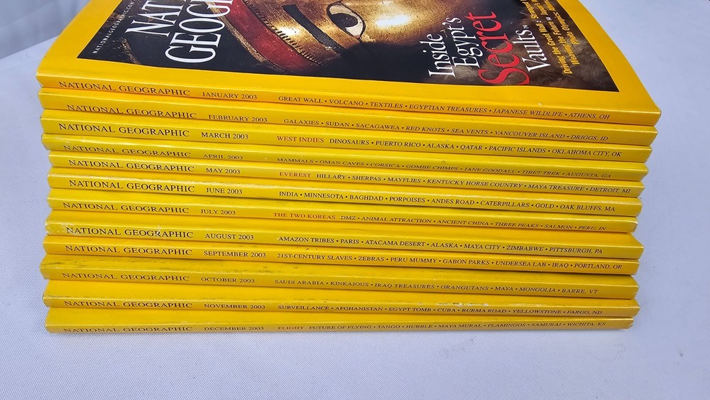 Available for sale in this lot is a National Geographic Magazine Complete Set for 2003 (January-December). This includes all 12 magazines and all are in mostly good condition and include original maps. Please check the photos. Payment: PayPal or eBay Payments. Shipping: We ship using USPS Ground Advantage or UPS ground.