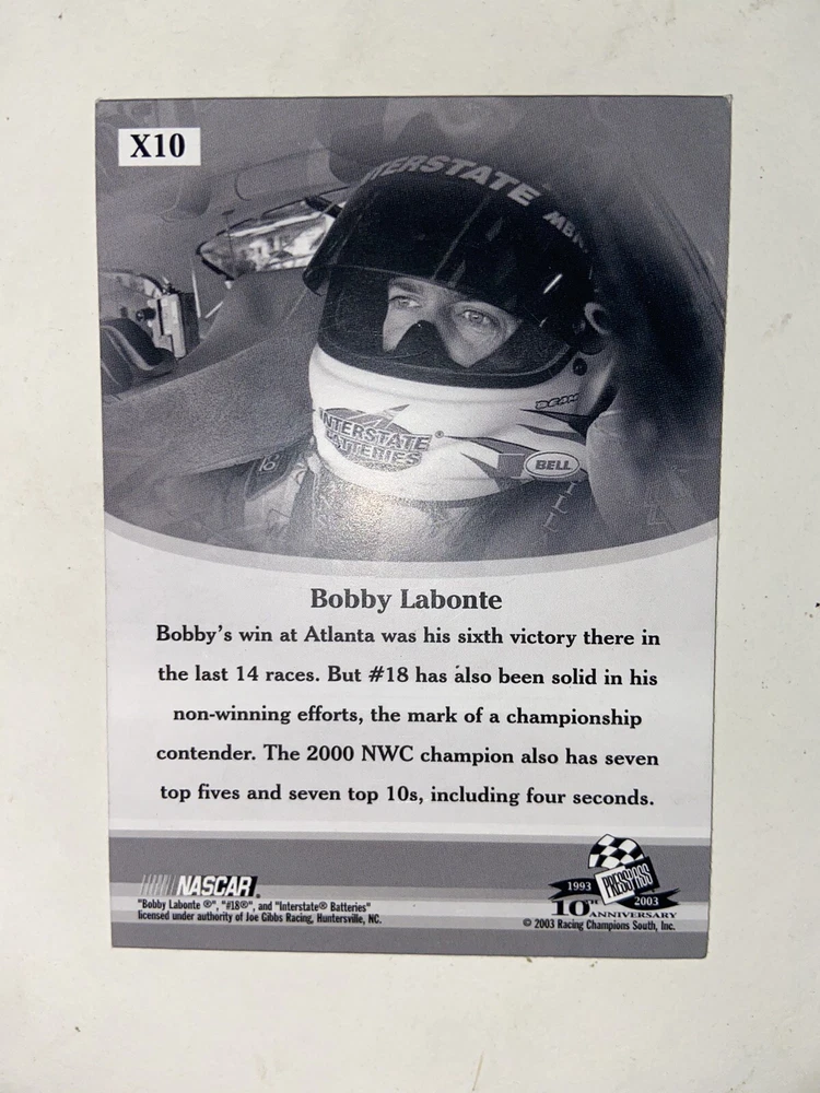 This is a 2003 VIP Explosives trading card featuring NASCAR driver Bobby Labonte. It is an original single trading card manufactured by Press Pass Inc. The card number is X10 and it falls under the Modern (1970-Now) period.