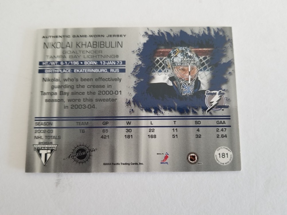 Season: 2003-04 Player/Athlete: Nikolai Khabibulin Player: Nikolai Khabibulin Type: Sports Trading Card Year Manufactured: 2003 Sport: Ice Hockey Card Name: Authentic Game-Worn Jersey - Nikolai Khabibulin Card Attributes: Memorabilia, SerialNumbered Athlete: Nikolai Khabibulin Card Manufacturer: Pacific Trading Cards Franchise: N/A Team: Tampa Bay Lightning Year: 2003-04 Product: Single-Parallel Parallel/Variety: Retail Manufacturer: Pacific Trading Cards Set: 2003-04 Pacific Private Stock Titanium - [Base] - Retail Card Number: 181 Original/Reprint: Original