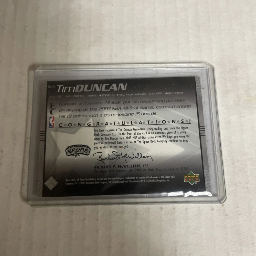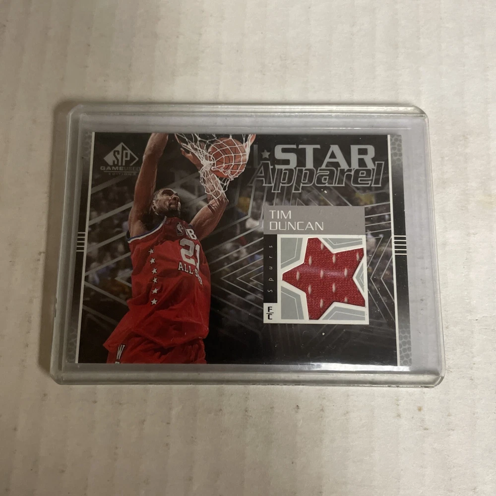 This is a 2003-04 SP Game Used trading card featuring Tim Duncan, a player from the San Antonio Spurs in the National Basketball Association (NBA). The card is from the All-Star Apparel insert set and contains memorabilia from the NBA All-Star Game. It is manufactured by Upper Deck and is part of a series that includes basketball players and their game-worn items.