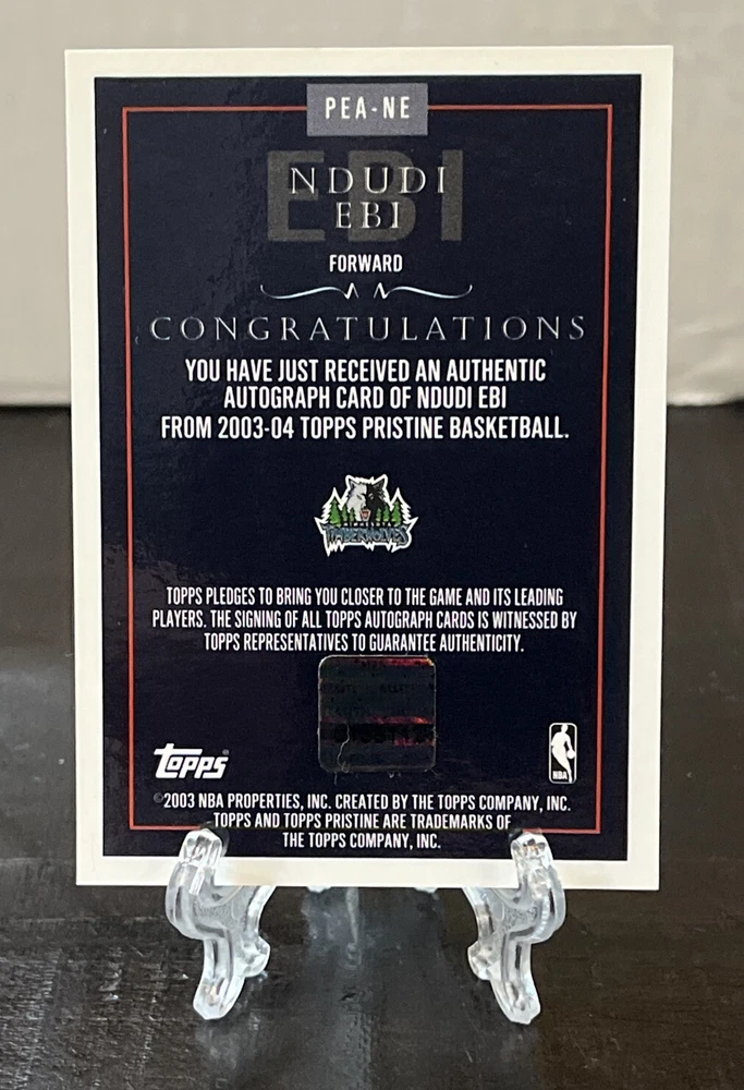 Season: 2003-04 Set: 2003-04 Topps Pristine League: National Basketball Association (NBA) Manufacturer: Topps Player/Athlete: Ndudi Ebi Insert Set: Personal Endorsements Autographs brand: Topps Team: Minnesota Timberwolves Autographed: Yes Features: Rookie, Insert Card Number: PEA-NE Series: Topps Pristine Sport: Basketball