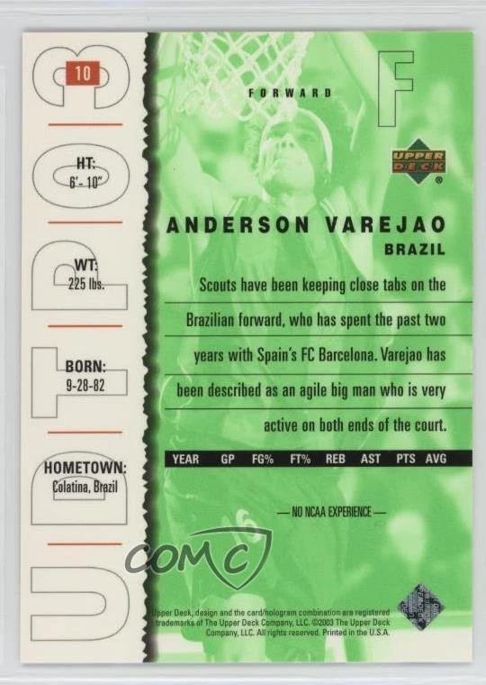 2003-04 Upper Deck UD Top Prospects - [Base] #10 Anderson Varejao - Rookie - Basketball Card - Featuring the FC Barcelona Bàsquet - Featuring Anderson Varejao Search for more: 2003-04 Upper Deck UD Top Prospects Search for more: 2003-04 Upper Deck UD Top Prospects - [Base] View all of our Listings Auctions Buy It Now About Us Located in the beautiful Pacific Northwest, COMC (Check Out My Cards) is the world's largest consignment service for trading card singles. More than 10,000 people have used our consignment service to list over 50 million trading cards. We currently house 20 million cards, each listed for sale with front and back images of the actual card. Find out how we can help you consign your items on eBay by contacting us through eBay messaging. COMC -- "The Safe & Easy Way to Buy & Sell" Representative Image - Select Specific Item above to see image of actual item Representative Image - Select Specific Item above to see image of actual item Raw Condition for Modern Cards Unless otherwise noted, raw modern cards are listed in Near Mint-Mint condition or better. A NM-MT card appears to be Mint at first glance, but upon closer inspection, may exhibit some of the following: minor print defects (e.g. roller marks, print line, dimple), minor scratches, slight edge wear, and slight corner wear. Centering is clearly visible in the images provided and does not factor into our condition assessment. Raw Condition for Vintage Cards Unless otherwise noted, raw vintage cards are listed in Excellent condition or better. An EX card may exhibit some of the following: minor rounding of corners, surface wear, print defects, light scratches, and slight edge wear/chipping. Centering is clearly visible in the images provided and does not factor into our condition assessment. Domestic Shipping Combined shipping for multiple items is available. To receive combined shipping, please ensure all desired items are in your eBay shopping cart before proceeding to checkout. eBay limits orders to 40 items per order. We automatically combine multiple orders placed on the same day. If you place multiple orders on the same day, please contact us to request a refund of applicable shipping costs. Signature confirmation may be required on invoices over $400. Raw cards are shipped in toploaders. International Shipping COMC offers eBay's International Shipping (EIS) for international orders under $2,500* (see country exceptions below). All duties and import fees are paid at checkout; in the rare event that there are additional import fees upon delivery, these are borne by the buyer. EIS packages route through a shipping hub in Erlanger, KY before shipping to their final destination. Please note that EIS does not allow for combined shipments. The shipping rates are determined by eBay and cannot be adjusted. *Maximum sale price exceptions: Colombia, Kuwait ($2,000); Taiwan ($1,539); Chile, Costa Rica, Guatemala, Honduras, Trinidad and Tobago ($1,000); Antigua and Barbuda, Aruba, Belize, Dominica, Grenada, Philippines, Saint Kitts and Nevis, Saint Lucia, Montserrat, Turks and Caicos Islands ($500); Dominican Republic, El Salvador ($200). Please request a shipping quote through eBay messaging for orders that exceed the maximum sale price supported by eBay's International Shipping. You will be responsible for all duties and import fees for international orders shipped outside the EIS. Raw cards are shipped in toploaders. Payment COMC does not accept offers on our cards through our eBay storefront. COMC utilizes eBay’s managed payments system. If you are experiencing difficulties making a payment, please contact eBay for assistance. Return Policy Returns are only accepted on the rare occasion the item is not as described. If you are making a return, please initiate the return process through eBay so a mailing label can be provided for you. Prior to listing, our expert team carefully assessed this item to represent it accurately. Please review the description and high-definition images prior to purchasing to ensure this item meets your satisfaction. We welcome you to contact us if you have further questions about this item. Trust and Integrity COMC carefully assesses each item consigned to us to prevent fraudulent items from entering the marketplace. If you believe an item offered on COMC may be fraudulent, please contact us with details so we can investigate the issue. Items we determine are outside our supported items policy may be removed. Last Modified: 1/16/2025 10:37:55 PM PDT