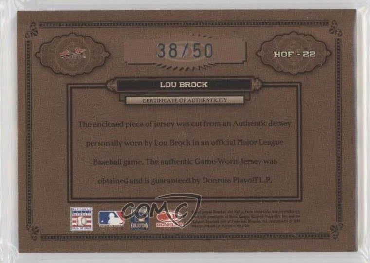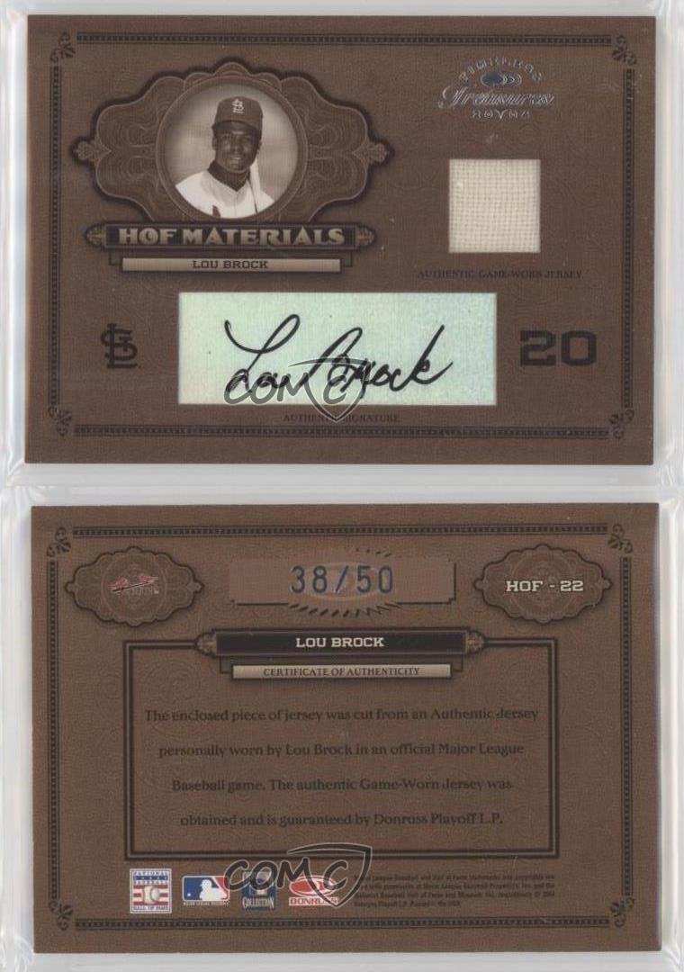 2004 Donruss Timeless Treasures - HOF Materials - Jersey Signatures #HOF-22 Lou Brock Qty Made: 50 - Baseball Card - Featuring the St. Louis Cardinals - Featuring Lou Brock Search for more: 2004 Donruss Timeless Treasures Search for more: 2004 Donruss Timeless Treasures - HOF Materials - Jersey Signatures View all of our Listings Auctions Buy It Now About Us Located in the beautiful Pacific Northwest, COMC (Check Out My Cards) is the world's largest consignment service for trading card singles. More than 10,000 people have used our consignment service to list over 50 million trading cards. We currently house 20 million cards, each listed for sale with front and back images of the actual card. Find out how we can help you consign your items on eBay by contacting us through eBay messaging. COMC -- "The Safe & Easy Way to Buy & Sell" Representative Image - Select Specific Item above to see image of actual item Representative Image - Select Specific Item above to see image of actual item Raw Condition for Modern Cards Unless otherwise noted, raw modern cards are listed in Near Mint-Mint condition or better. A NM-MT card appears to be Mint at first glance, but upon closer inspection, may exhibit some of the following: minor print defects (e.g. roller marks, print line, dimple), minor scratches, slight edge wear, and slight corner wear. Centering is clearly visible in the images provided and does not factor into our condition assessment. Raw Condition for Vintage Cards Unless otherwise noted, raw vintage cards are listed in Excellent condition or better. An EX card may exhibit some of the following: minor rounding of corners, surface wear, print defects, light scratches, and slight edge wear/chipping. Centering is clearly visible in the images provided and does not factor into our condition assessment. Domestic Shipping Combined shipping for multiple items is available. To receive combined shipping, please ensure all desired items are in your eBay shopping cart before proceeding to checkout. eBay limits orders to 40 items per order. We automatically combine multiple orders placed on the same day. If you place multiple orders on the same day, please contact us to request a refund of applicable shipping costs. Signature confirmation may be required on invoices over $400. Raw cards are shipped in toploaders. International Shipping COMC offers eBay's International Shipping (EIS) for international orders under $2,500* (see country exceptions below). All duties and import fees are paid at checkout; in the rare event that there are additional import fees upon delivery, these are borne by the buyer. EIS packages route through a shipping hub in Erlanger, KY before shipping to their final destination. Please note that EIS does not allow for combined shipments. The shipping rates are determined by eBay and cannot be adjusted. *Maximum sale price exceptions: Colombia, Kuwait ($2,000); Taiwan ($1,539); Chile, Costa Rica, Guatemala, Honduras, Trinidad and Tobago ($1,000); Antigua and Barbuda, Aruba, Belize, Dominica, Grenada, Philippines, Saint Kitts and Nevis, Saint Lucia, Montserrat, Turks and Caicos Islands ($500); Dominican Republic, El Salvador ($200). Please request a shipping quote through eBay messaging for orders that exceed the maximum sale price supported by eBay's International Shipping. You will be responsible for all duties and import fees for international orders shipped outside the EIS. Raw cards are shipped in toploaders. Payment COMC does not accept offers on our cards through our eBay storefront. COMC utilizes eBay’s managed payments system. If you are experiencing difficulties making a payment, please contact eBay for assistance. Return Policy Returns are only accepted on the rare occasion the item is not as described. If you are making a return, please initiate the return process through eBay so a mailing label can be provided for you. Prior to listing, our expert team carefully assessed this item to represent it accurately. Please review the description and high-definition images prior to purchasing to ensure this item meets your satisfaction. We welcome you to contact us if you have further questions about this item. Trust and Integrity COMC carefully assesses each item consigned to us to prevent fraudulent items from entering the marketplace. If you believe an item offered on COMC may be fraudulent, please contact us with details so we can investigate the issue. Items we determine are outside our supported items policy may be removed. Last Modified: 12/24/2024 5:19:35 PM PDT
