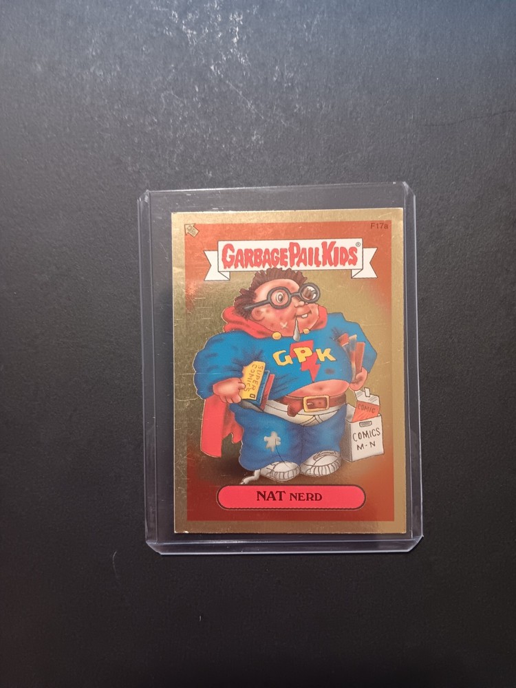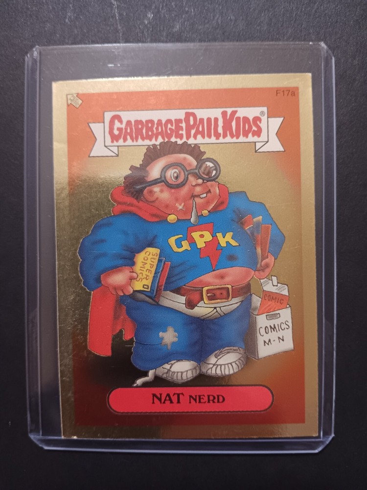 The 2004 Garbage Pail Kids #F17a NAT NERD Gold Foil trading card is a unique and collectible item from the All New Series 2 set. Manufactured by Topps, this non-sport trading card features the character Nat Nerd in a special gold foil variety. This chase card is original and part of the Gold Foil insert set, making it a sought-after piece for collectors. With a nod to the popular TV show Superman, this card is a valuable addition to any trading card collection.
