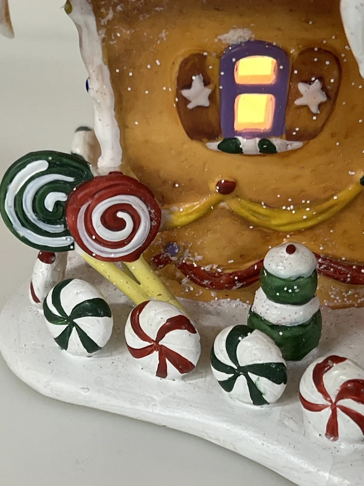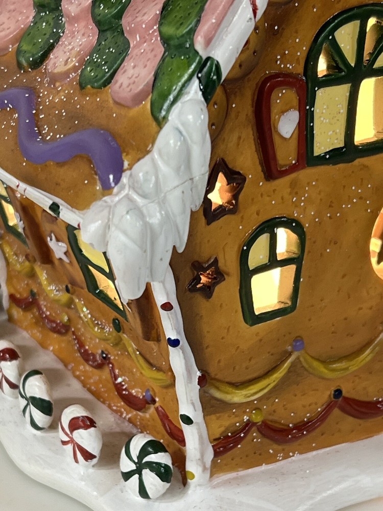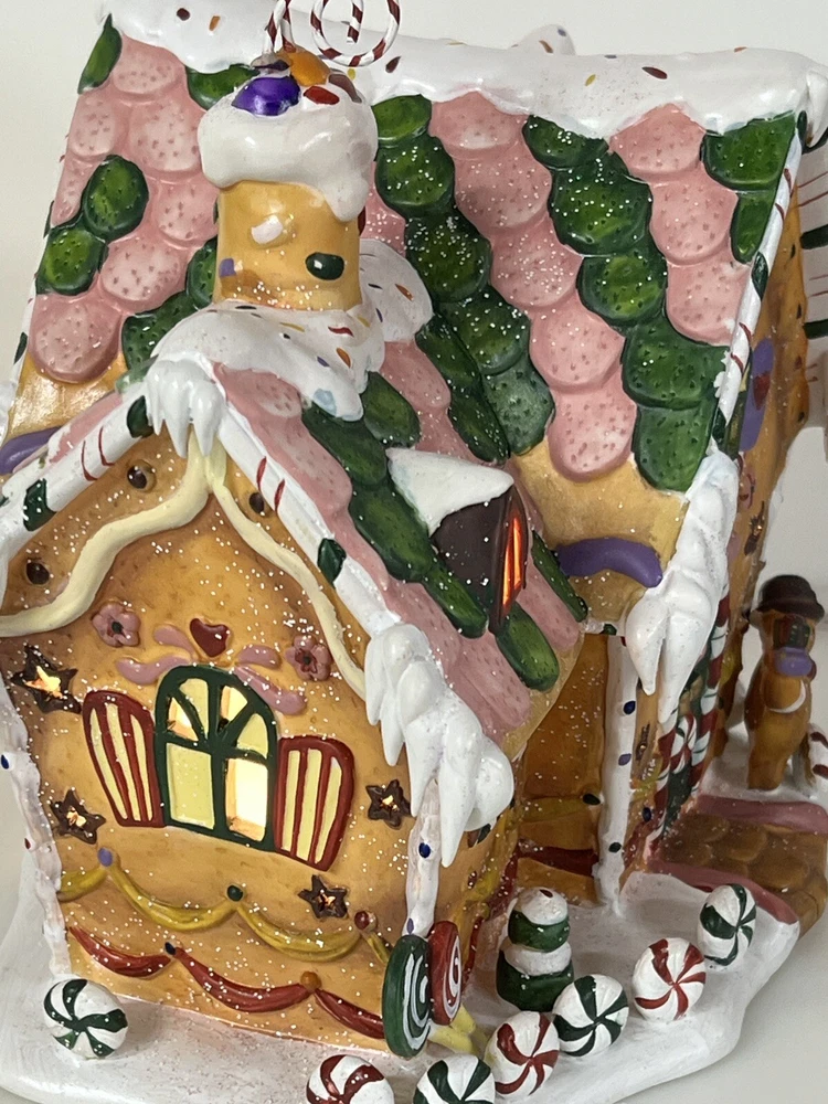 Holiday Time 2004 Village Collectibles Gingerbread House is a Medium-sized, hand-painted porcelain Christmas village piece. With a whimsical, Traditional style, it features an Asymmetrical shape with a 3D effect. This Limited Edition, Retired item is illuminated and has a textured finish, suitable for every day or seasonal display. Standing at 9 inches tall, it showcases a colorful, Multicolor design of a Gingerbread character. Perfect for any room, this collectible piece captures the festive Christmas theme. Beautiful piece , small repair on “ icicles “ on back corner of building, hard to see , picture # 3 . No original box , comes with light & cord Very good condition, very rare