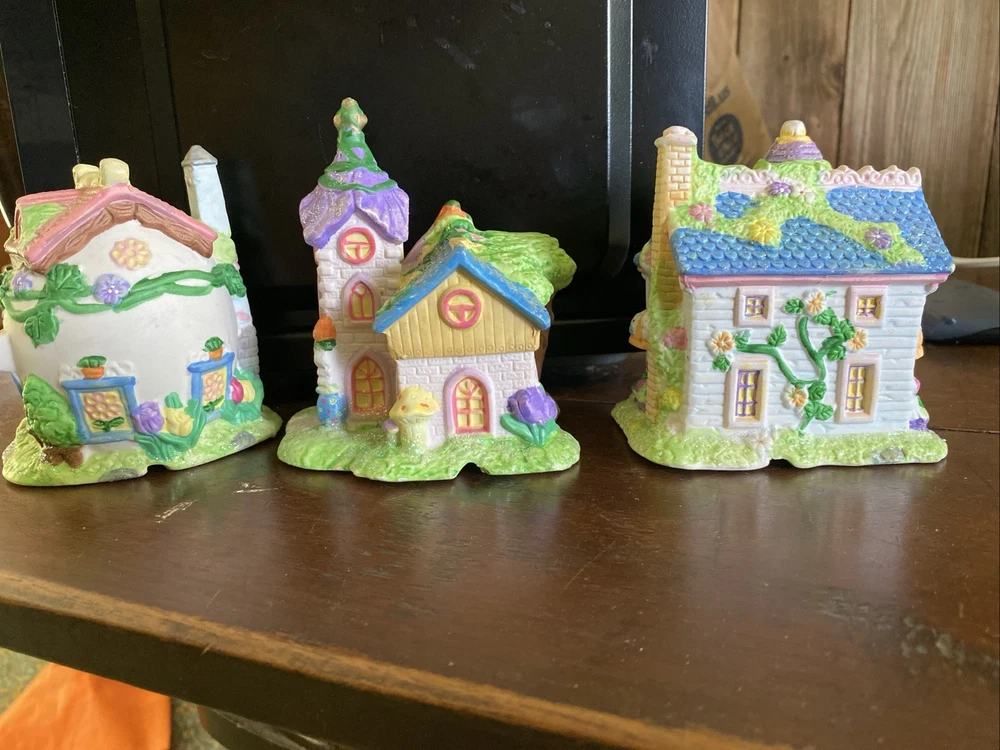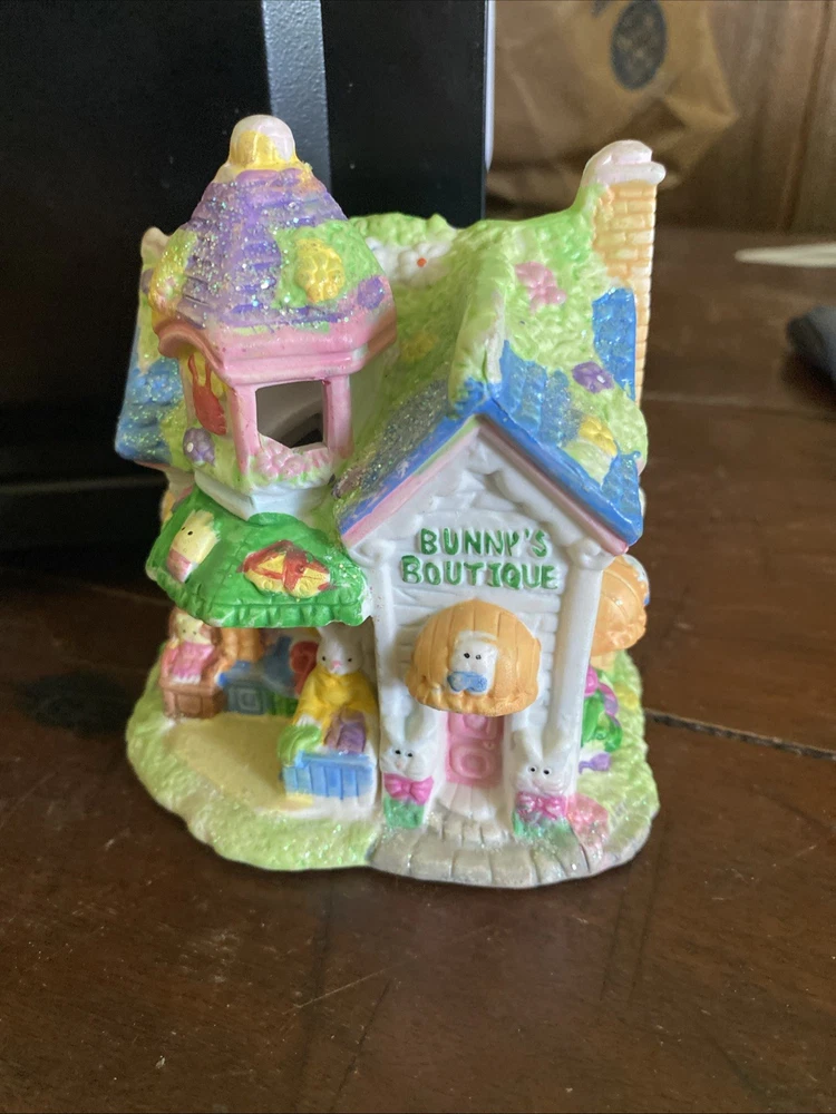 The Hoppy Hollow 2004 Easter Bunny Village features a charming church, bunny's boutique, and flower shop, all designed in a pastel color scheme with a floral pattern. Made of ceramic and porcelain, this collectible set from the Easter Bunny Village collection by Hoppy Hollow is perfect for celebrating spring and the Easter season. The delightful village scene is ideal for displaying in any shop or room, adding a whimsical touch of Easter joy to your home decor.