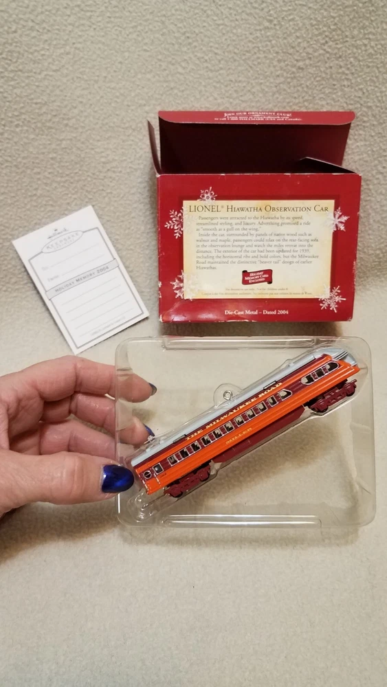 Here is a Hallmark Keepsake ornament, die cast metal- dated 2004, Lionel Hiawatha Observation Car, in box. I will only ship within the USA. 112724