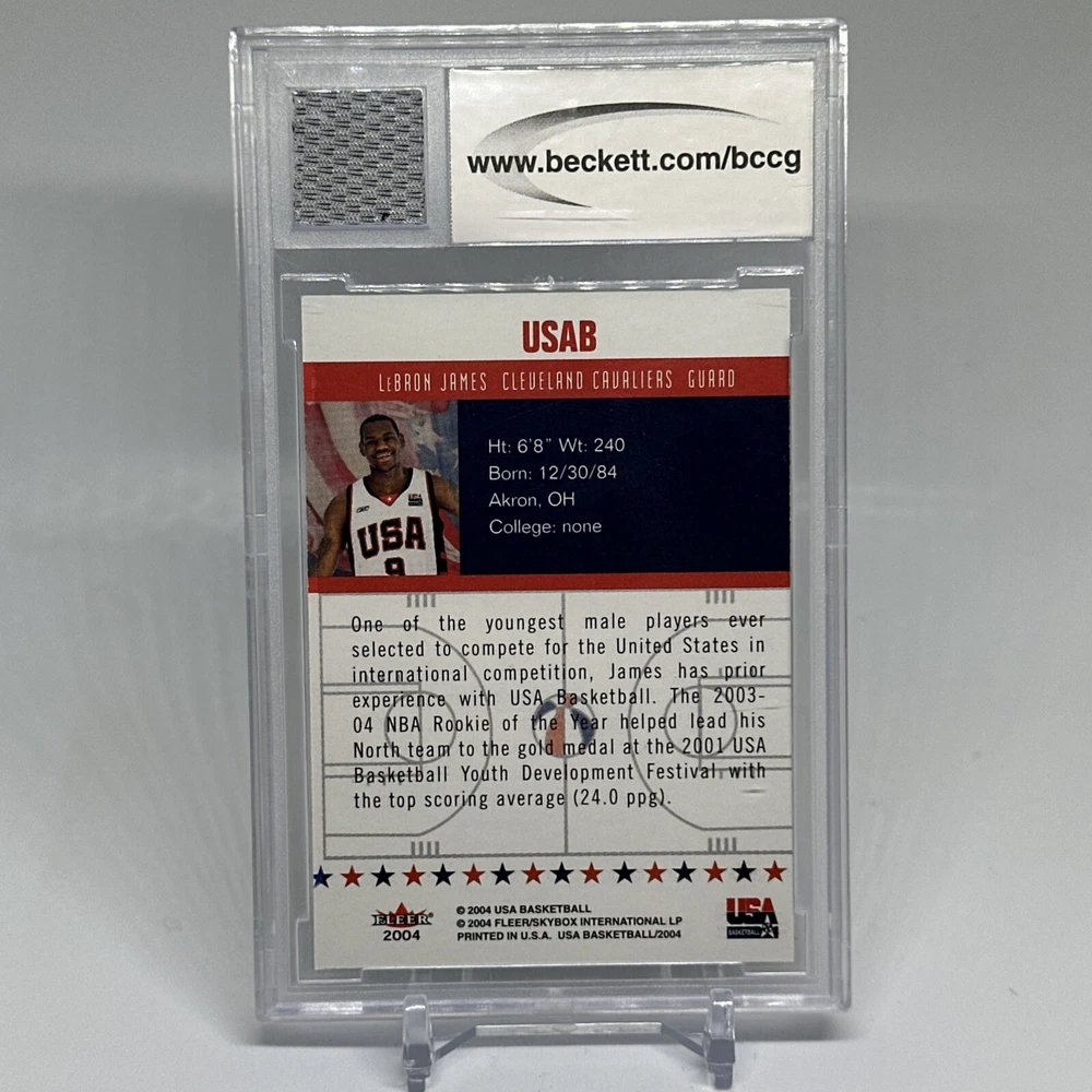 2004 LeBron James Fleer Team USA practice worn Olympic Jersey card Gem Mint 10. This one of a kind memorabilia card features a swatch of LEBRON JAMES PRACTICE WORN 2004 TEAM USA OLYMPIC JERSEY!!! You will not find this card again. Much less a GEM MINT 10 specimen!!! Pop 2..