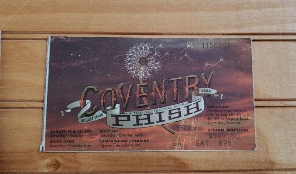 I have this rare poster of Coventry Festival in Vermont 8-14/15-2004. It is an Amy Milligan work. It comes with a mail order ticket stub and a festival map Saddest final "Curtain"...this festival was just hard for everyone on so many levels. The mud was fn crazy...lost shoes. Last shows...forever for all we knew. Trying to find your car along some random road after. SET 1 : Walls of the Cave > Runaway Jim -> Gotta Jibboo , You Enjoy Myself > Sample in a Jar > Axilla > Poor Heart > Run Like an Antelope [1] , Fire SET 2 : AC/DC Bag -> 46 Days > Halley's Comet -> Ya Mar , David Bowie , Character Zero SET 3 : Twist -> The Wedge , Stash > Free , Guyute , Drowned > Friday ENCORE : Harry Hood [2] [1] Tom Marshall on vocals. [2] With Trey banter. At the end of Hood, the band stopped playing allowing the audience to sing the "You can feel good, good, good about Hood" refrain. This was the first show of the Coventry festival and was simulcast in movie theaters nationwide. During YEM, the band gave away their trampolines. Throughout the duration of the set, groups of fans held the trampolines above their heads, and some fans jumped on the trampolines as well. Tom Marshall sang the lyrics to Antelope. Trey teased Waves in Halley's Comet. Before Bowie, Trey told a story of the summer he spent living in a cabin in the Northeast Kingdom where he remembered writing several songs, including Bowie. Trey explained that Bowie was an attempt to see “how far can you push it in the harmonic and rhythmic language and still have people dancing.” During Hood, Trey (speaking in rhythm) noted that because there were a row of rocks separating the band from the crowd, they were feeling a certain level of disconnect (particularly when Mike plays a "sexy" note). To remedy the situation, Trey and Mike ventured down onto the rocks for the duration of the song. At the end of Hood, the band stopped playing, allowing the audience to sing the “You can feel good, good, good about Hood” refrain. SET 1 : Mike's Song > I Am Hydrogen > Weekapaug Groove , Anything But Me , Reba , Carini > Chalk Dust Torture -> Possum > Wolfman's Brother [1] > Taste SET 2 : Down with Disease [2] > Wading in the Velvet Sea [3] , Glide , Split Open and Melt -> Ghost SET 3 : Fast Enough for You , Seven Below [4] -> Simple > Piper -> Cool Jerk [5] -> The Dickie Scotland Song [6] , Wilson > Slave to the Traffic Light ENCORE : The Curtain With [7] [1] Explanation from Trey as to the history of the song; also features Trey's mom, Mike's mom and John Paluska on "sexy bump". [2] Unfinished. [3] Page and Trey break down. [4] "Seven Below" shouted by all band members sporadically during the jam. [5] Phish debut; lyrics changed to honor Mark "Bruno" Bradley. [6] Debut; lyrics referenced Hadden Hipsley and Dickie Scotland [7] Jam segment stopped and restarted in correct key. This was the second show of the Coventry festival and was the presumed “Final Show.” When Trey made his “break-up” announcement the preceding May, he indicated that Coventry would be the final Phish shows. In reality, this turned out to be the final public show for over four and a half years. This show was simulcast in movie theaters nationwide. Before Anything But Me, Trey announced that, for the first time in 21 years, he was nervous performing a Phish show. During Wolfman’s, Trey revealed that the Wolfman’s Brother is, in fact, Fish (as well as the fact that he handed the phone to his friend Liz Durfee). Also, during Wolfman’s, Trey and Mike invited their mothers onstage (and later John Paluska) to do the “sexy bump” dance. Disease was unfinished and featured Trey briefly playing his guitar with a glow stick. Both Page and Trey broke down during an especially emotional Velvet Sea. After a thoroughly botched Glide, all four band members offered words of thanks to the fans for their continued support and dedication and brief reflections on their twenty years together. Trey then stated that what they really needed to do was “blow off some fucking steam” before starting up Melt. There was an enormous glow stick war during Ghost featuring hundreds, if not thousands, of orange glow sticks. This version of Seven Below saw all of the band members sporadically shouting “Seven Below” throughout the jam. The Phish debut of Cool Jerk contained alternate lyrics honoring monitor mixer, Mark “Bruno” Bradley. The Dickie Scotland Song was spontaneously created and included lyrics in honor of production manager, Hadden Hipsley, and tour accountant, Richard Glasgow (a.k.a. Dickie Scotland). Before Wilson, Trey asked the crowd to sing to another of their friends “for the last time.” There was a fireworks display between the end of the third set and the encore. Before the encore, while explaining the origins of The Curtain, Trey jokingly announced that the entire Chicago Symphony and the Twyla Tharp Dance Troupe were going to perform Gamehendge. Trey explained that they chose The Curtain With as the last song to bring them full circle, because, not only was it one of the first Phish songs he wrote, but he wrote it in a cabin one town over from Coventry. Trey stopped and restarted the jam segment of the Curtain With, because they were in the wrong key or, as he explained, ”Since we are going to be bringing ourselves back in time, we may as well do it in the correct key.” There was no P.A. music after the