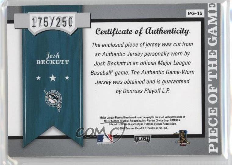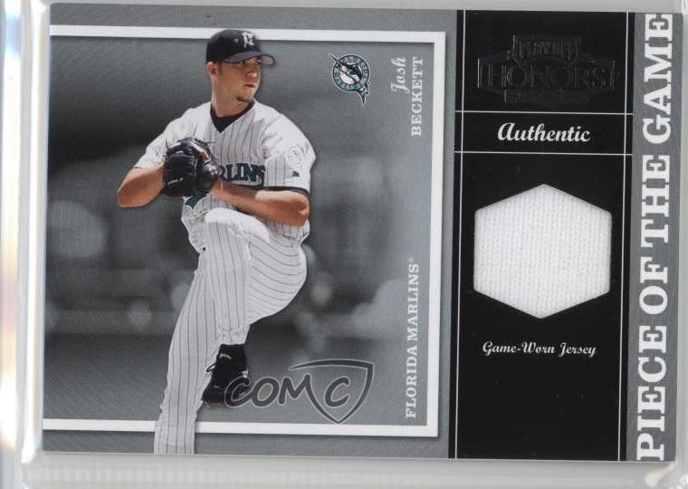 2004 Playoff Honors - Piece of the Game - Jerseys #PG-15 Josh Beckett Qty Made: 250 - Baseball Card - Featuring the Miami Marlins - Featuring Josh Beckett Search for more: 2004 Playoff Honors Search for more: 2004 Playoff Honors - Piece of the Game - Jerseys View all of our Listings Auctions Buy It Now About Us Located in the beautiful Pacific Northwest, COMC (Check Out My Cards) is the world's largest consignment service for trading card singles. More than 10,000 people have used our consignment service to list over 50 million trading cards. Find out how we can help you consign your items on eBay by contacting us through eBay messaging. COMC -- "The Safe & Easy Way to Buy & Sell" Representative Image - Select Specific Item above to see image of actual item Representative Image - Select Specific Item above to see image of actual item Raw Condition for Modern Cards Unless otherwise noted, raw modern cards are listed in Near Mint-Mint condition or better. A NM-MT card appears to be Mint at first glance, but upon closer inspection, may exhibit some of the following: minor print defects (e.g. roller marks, print line, dimple), minor scratches, slight edge wear, and slight corner wear. Centering is clearly visible in the images provided and does not factor into our condition assessment. Raw Condition for Vintage Cards Unless otherwise noted, raw vintage cards are listed in Excellent condition or better. An EX card may exhibit some of the following: minor rounding of corners, surface wear, print defects, light scratches, and slight edge wear/chipping. Centering is clearly visible in the images provided and does not factor into our condition assessment. Domestic Shipping Combined shipping for multiple items is available. To receive combined shipping, please ensure all desired items are in your eBay shopping cart before proceeding to checkout. eBay limits orders to 40 items per order. We automatically combine multiple orders placed on the same day. If you place multiple orders on the same day, please contact us to request a refund of applicable shipping costs. Signature confirmation may be required on invoices over $400. All cards are protected and shipped securely. International Shipping COMC offers eBay's International Shipping (EIS) for international orders under $2,500* (see country exceptions below). All duties and import fees are paid at checkout; in the rare event that there are additional import fees upon delivery, these are borne by the buyer. EIS packages route through a shipping hub in Erlanger, KY before shipping to their final destination. Please note that EIS does not allow for combined shipments. The shipping rates are determined by eBay and cannot be adjusted. *Maximum sale price exceptions: Colombia, Kuwait ($2,000); Taiwan ($1,539); Chile, Costa Rica, Guatemala, Honduras, Trinidad and Tobago ($1,000); Antigua and Barbuda, Aruba, Belize, Dominica, Grenada, Philippines, Saint Kitts and Nevis, Saint Lucia, Montserrat, Turks and Caicos Islands ($500); Dominican Republic, El Salvador ($200). Please request a shipping quote through eBay messaging for orders that exceed the maximum sale price supported by eBay's International Shipping. You will be responsible for all duties and import fees for international orders shipped outside the EIS. All cards are protected and shipped securely. Payment COMC does not accept offers on our cards through our eBay storefront. COMC utilizes eBay’s managed payments system. If you are experiencing difficulties making a payment, please contact eBay for assistance. Return Policy Returns are only accepted on the rare occasion the item is not as described. If you are making a return, please initiate the return process through eBay so a mailing label can be provided for you. Prior to listing, our expert team carefully assessed this item to represent it accurately. Please review the description and high-definition images prior to purchasing to ensure this item meets your satisfaction. We welcome you to contact us if you have further questions about this item. Trust and Integrity COMC carefully assesses each item consigned to us to prevent fraudulent items from entering the marketplace. If you believe an item offered on COMC may be fraudulent, please contact us with details so we can investigate the issue. Items we determine are outside our supported items policy may be removed. Last Modified: 6/19/2025 3:44:46 AM PDT