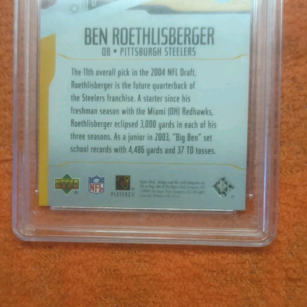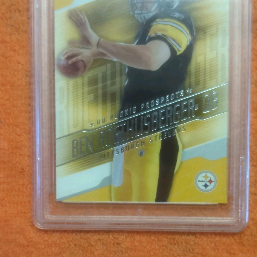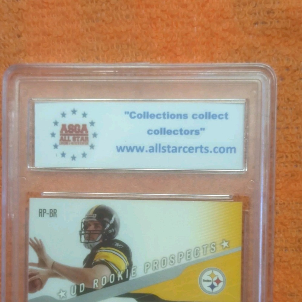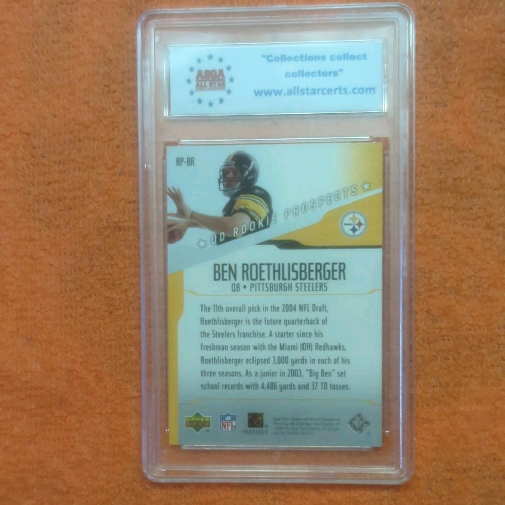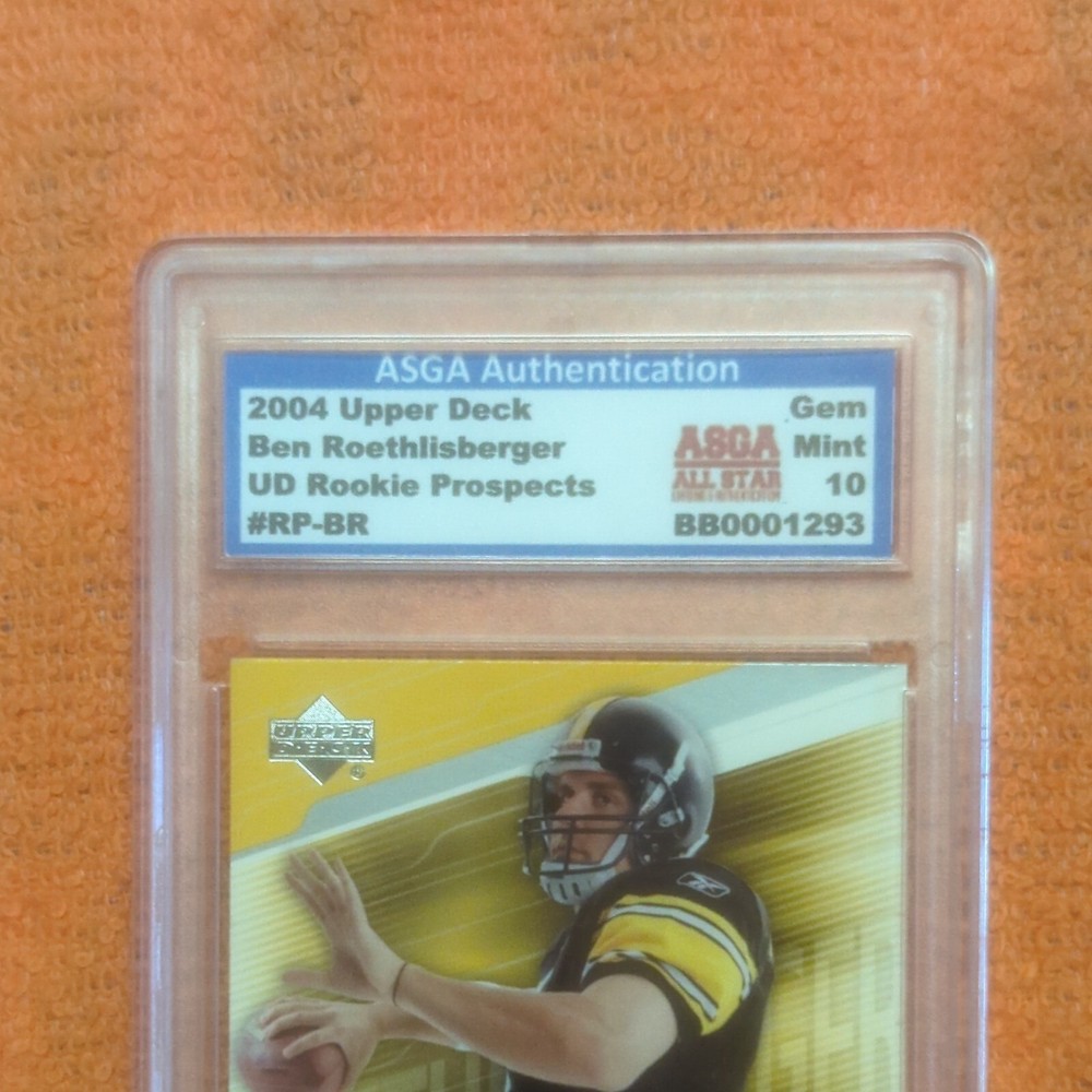 Elevate your collection with the 2004 Upper Deck Rookie Prospects #RP-BR Ben Roethlisberger card, a must-have for fans and collectors alike. Graded Gem Mint 10 by All Star Grading & Authentication (ASGA), this card showcases the Pittsburgh Steelers' legendary quarterback in his rookie season, capturing the promise and potential that has become synonymous with his storied NFL career. This sought-after base set card from Upper Deck's 2004 collection is an original, non-autographed piece that stands out with its UD Rookie Prospects parallel/variety. Cherish the impeccable preservation and quality of this English-language card, a testament to Roethlisberger's illustrious place in football history.
