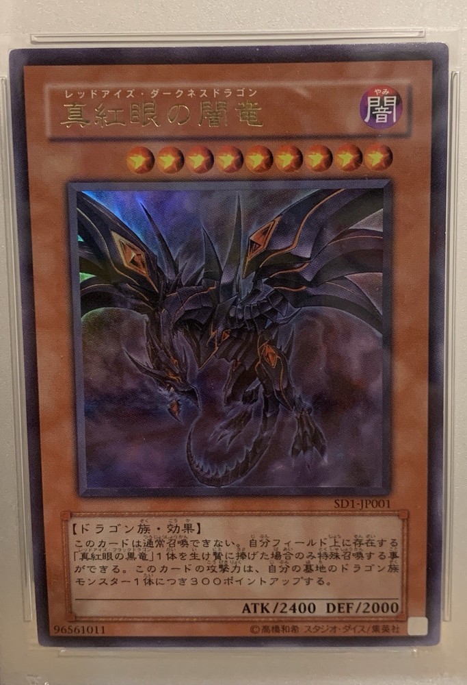 2004 YU-GI-OH! JPN STRUCTURE DECK: DRAGON'S ROAR RED-EYES DARKNESS DRAGON PSA 8 Had it in my old collection and it looked like it was in a pretty good condition plus it's a vintage holo card so I decided to get it graded. Centering is off on the back so I didn't expect it to get a 10 but still got a good grade all things considered. Not a huge Red eyes Black Dragon nerd so I thought mind as well give it to someone who'd love it.