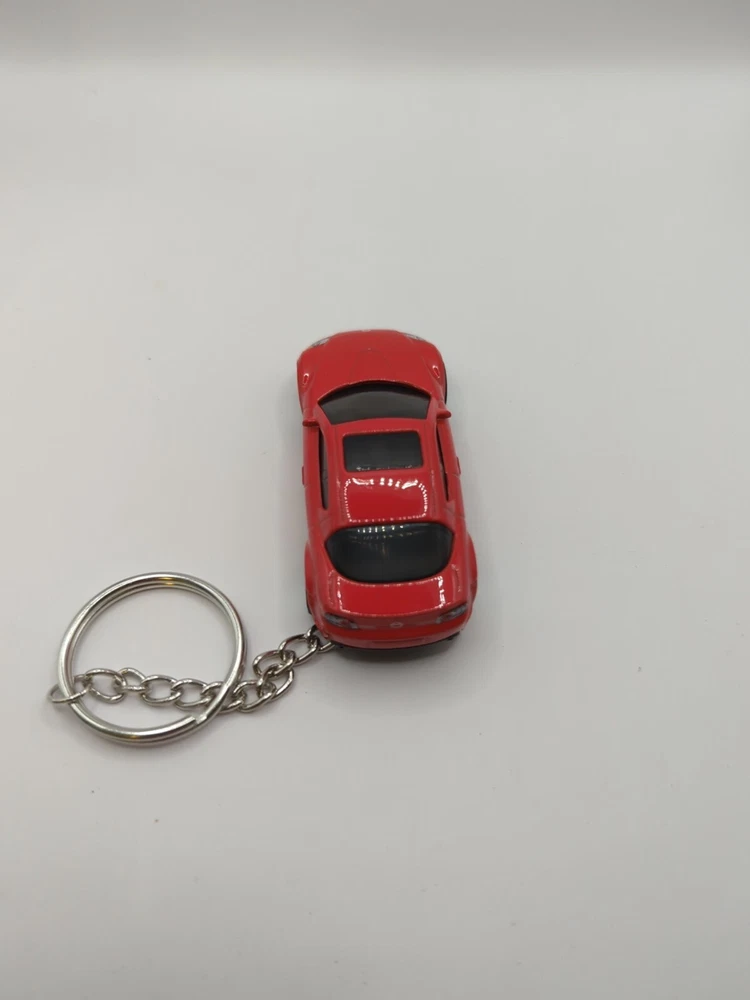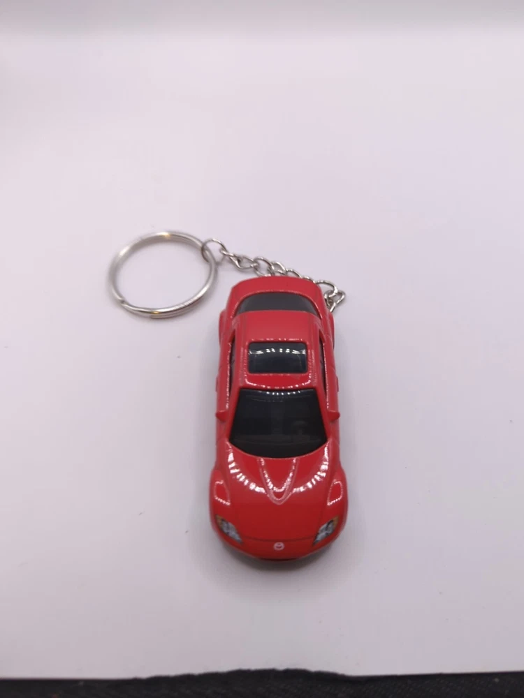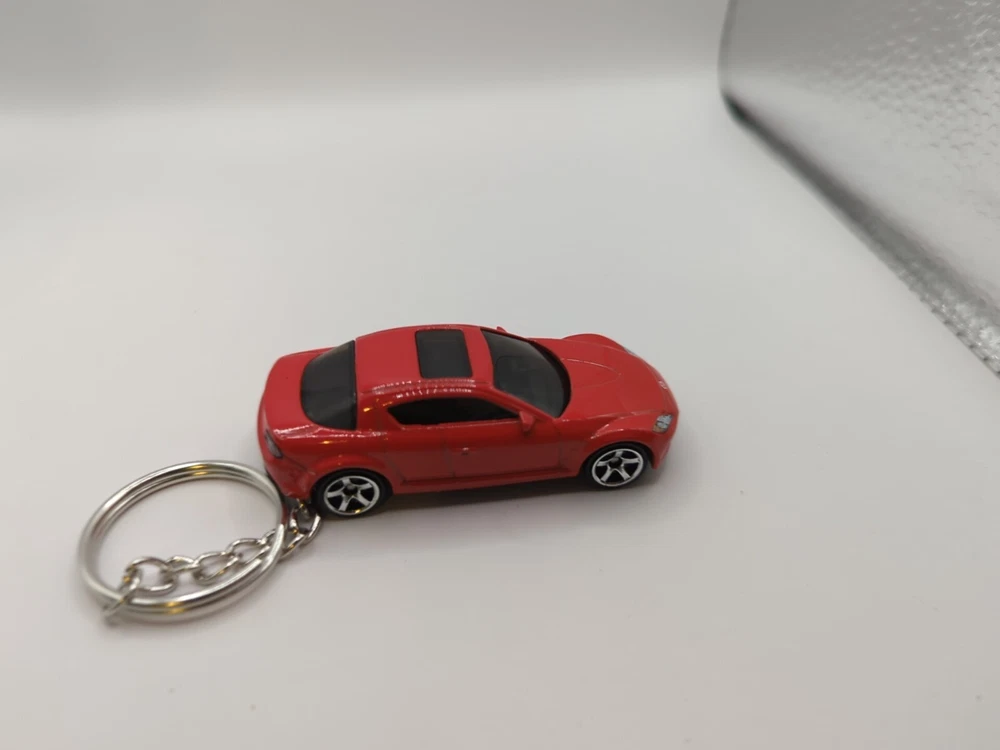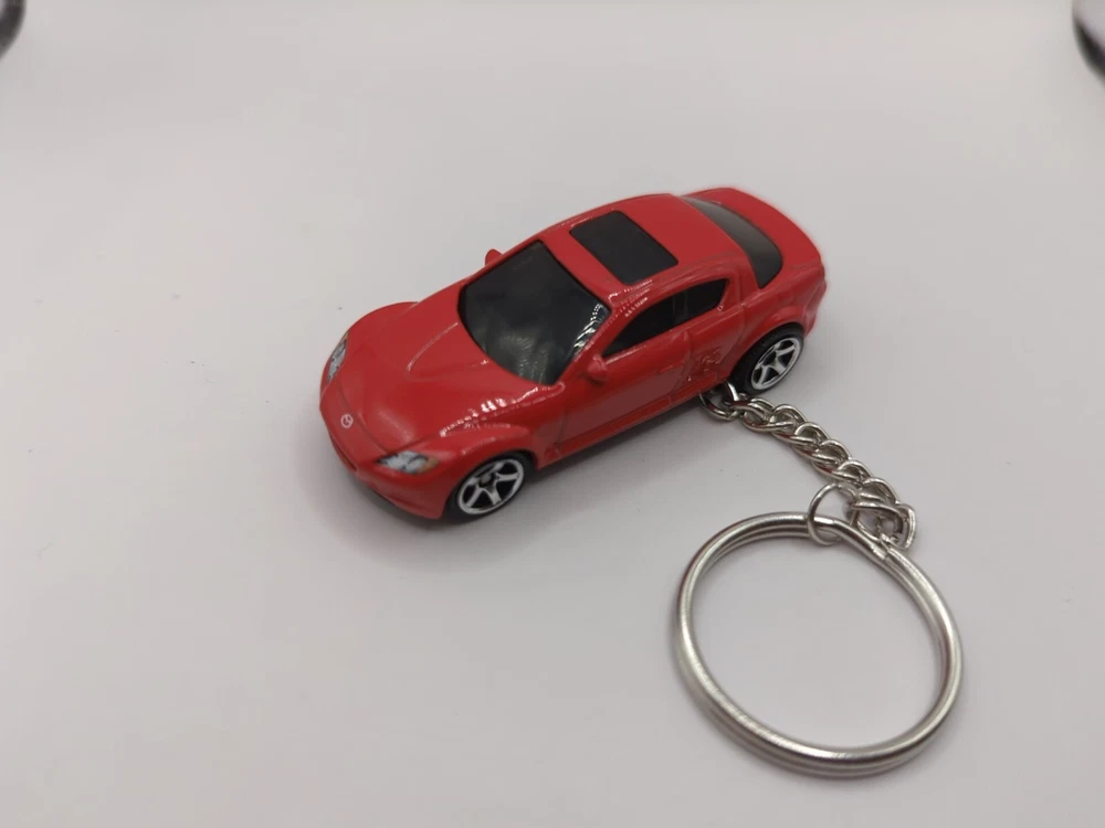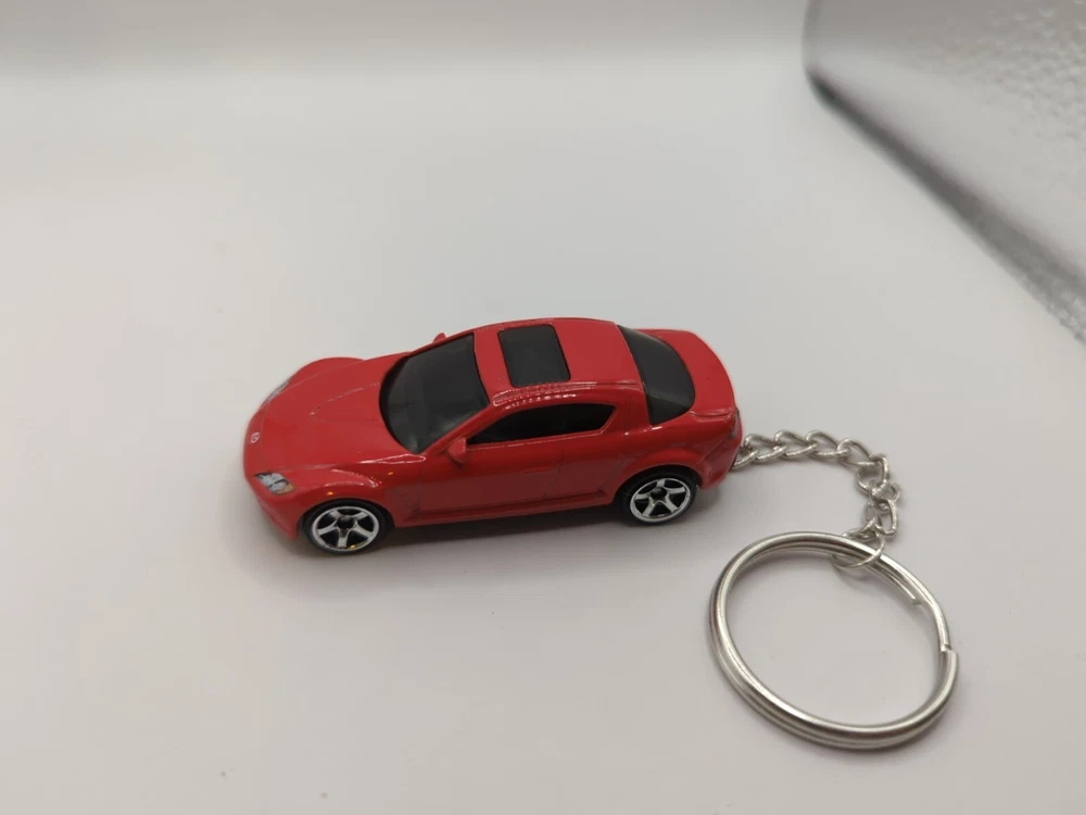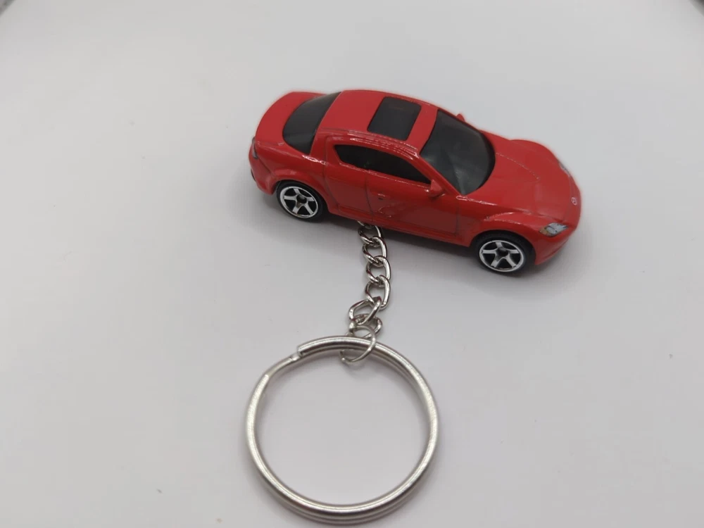 The product is a Matchbox keychain keyring featuring a 1:64 scale model of a 2004 Mazda RX-8 in a vibrant red color. The miniature car is made from diecast and plastic materials, replicating the design of the Mazda RX-8 with intricate details. This collectible item is a perfect addition for enthusiasts of diecast toy vehicles or fans of the Mazda brand, adding a touch of automotive flair to keys or bags. No drilling on the vehicle thank you