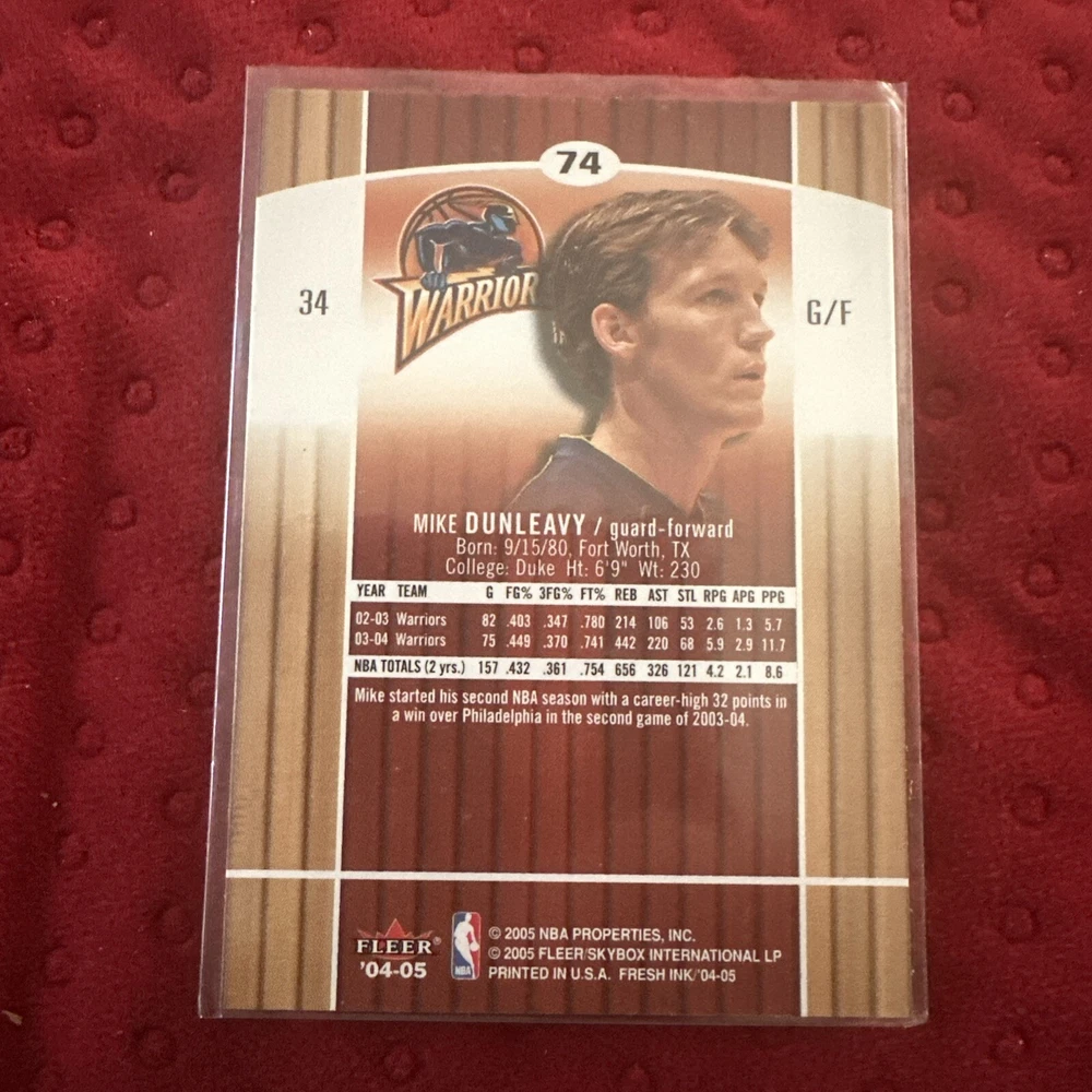 The product is a 2004-05 Skybox Fresh Ink trading card featuring basketball player Mike Dunleavy Jr. The card is categorized as a sports trading card and is part of the 2004-5 Skybox set manufactured by SkyBox. This specific card is numbered #74 in the set and likely includes a signature or other ink-related element, given the "Fresh Ink" designation in the title. It would be a desirable item for collectors of sports memorabilia, particularly fans of Mike Dunleavy Jr. or basketball trading cards from the 2004-05 season.