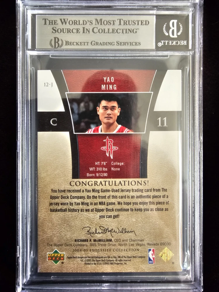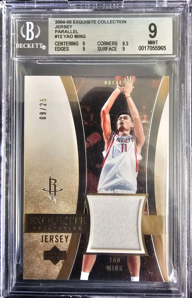 This is a POP 1 with no higher grades. This card has the serial number 9/25 This 2004-05 Upper Deck Exquisite Collection sports trading card features Yao Ming, a former Houston Rockets player, and is a must-have for any basketball fan. The card is graded a 9 by Beckett Grading Services (BGS) and is part of a limited print run of only 25. The card also includes a jersey piece and is serial numbered for added authenticity. It is a rare find and perfect for collectors looking to add to their memorabilia. This card is from the 2004-05 season and is part of the National Basketball Association (NBA) league.