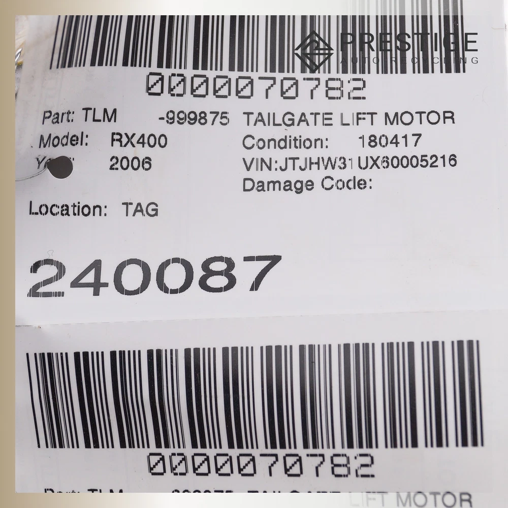 Prestige Auto Parts - Product Page Local pick-up available at 3400 Sunrise Blvd, Rancho Cordova, CA 95742 2004-2009 LEXUS RX400H RX350 RX330 Tailgate Liftgate Motor Back Door 68910-48010 Not sure if the part fits? Send us your VIN, and we'll verify compatibility for you! Item Condition The item is in good condition, fully operational, and demonstrates normal signs of use. Please note that, as a used part, it may show light scuffs, scratches, or other minor imperfections, as shown in the photos provided. WHEN YOU BUY FROM US YOU AGREE TO OUR TERMS AND CONDITIONS: It is the buyer's responsibility to carefully inspect all of the photos for details and/or request more photos if necessary, what you see in photos is exactly what you will receive. Before purchase, the buyer MUST verify that the item will fit their vehicle. PLEASE NOTE: Make sure to verify fitment independently with your local dealer, information in the “compatibility” section is generated by eBay Motors, not from us. IF YOU HAVE ANY QUESTIONS, CONTACT US VIA EBAY MESSAGING BEFORE PURCHASING. Payment We accept PayPal, VISA, MasterCard, Discover, and American Express. Sales tax collected by eBay where applicable. For local orders, pay on pickup available. Shipping Most items ship within 24 hours of payment; items paid for on the weekend or holidays ship on the following business day. We ship by FedEx, UPS, USPS, and regional freight/LTL carriers, whichever option is most affordable and/or faster. Shipping prices for ground apply only to the continental United States. Anywhere else is considered international shipping and will have an international shipping rate. Any international customs fees are the responsibility of the buyer. Any free shipping we offer is for the continental United States only. If you are from Hawaii, Alaska, or a Territory of the United States, please request a shipping total before bidding and we will do our best to keep the cost low. For orders placed outside of the United States, we ship ONLY through the eBay Global Shipping Program. If you are outside of the US, use the eBay international shipping tool above to receive a price for shipping costs. Local pickup and delivery options also available, please contact us for arrangements. PLEASE NOTE: Oversized items like engines, transmissions, bumpers, doors, hoods, trunk lids, fenders and other similar items will be shipped via Freight Shipping and MUST be shipped to a business address with a dock or forklift access; otherwise, liftgate and/or residential delivery fees may apply. YOU MUST CONTACT US FIRST FOR A QUOTE BEFORE PURCHASING SAID ITEMS. Warranty and Returns All returns must be made within 30 days of item being received by the customer only if the item is non-functional or if it differs substantially from the description. Buyer is fully responsible for shipping cost of the return. We are not liable to pay for any labor fees associated with the installation or removal of any parts sold by us. All electronics are tested before removed from vehicle. IF NOT FUNCTIONAL, WE WILL NOT SELL. If the item is defected we will state accordingly and is sold for parts only. If you have any questions about the part you’re bidding on, PLEASE ASK QUESTIONS PRIOR TO BIDDING. 90 DAY WARRANTIES are available. Contact Us If you have questions about any part, please contact us BEFORE purchasing via eBay messaging. HOW DID WE DO? We are a small, family owned business dependent on our valuable customers. Once you have received your item in satisfactory condition, would you be so kind as to leave us feedback? If there is a concern that would cause you to want to leave negative feedback, please contact us first and we will do our best to resolve the issue. Thank you and God bless! © 2025 Prestige Auto Recycling. All rights reserved.