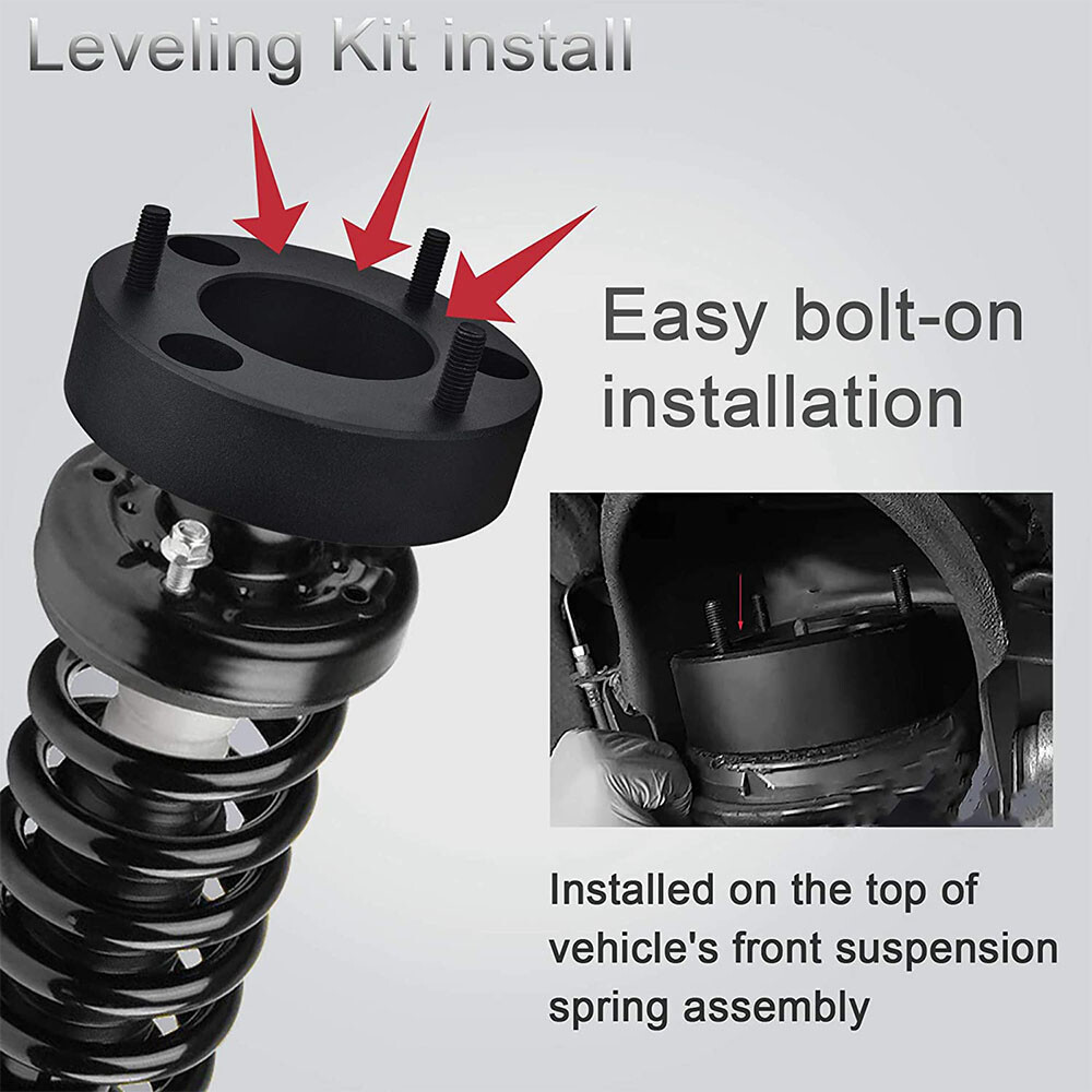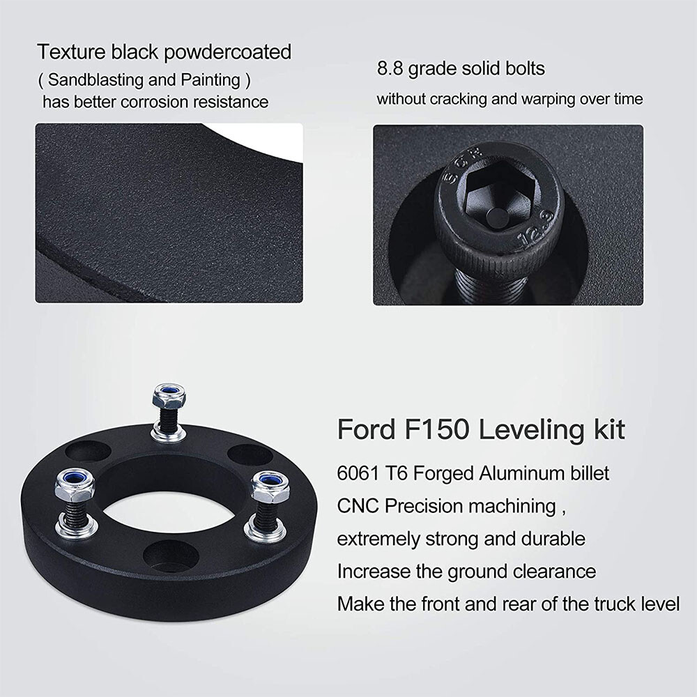 Fitment Fits for Ford F150 2WD/4WD 2004-2023 Fits for Ford Expedition 2003-2018 Fits for Lincoln Mark LT base 2005-2008 Note:Leveling kit will raise your car 3.0 inch in the front. The ratio between lift height and kit thickness is not 1:1 because of suspension geometry. Package: 2 x Front Leveling Lift Kit 1 Set Nut 2.0" Front Ford Lift Kit Leveling Kit for 2004-2024 Ford F150 Expedition Mark LT 【Lift 2.0 inch for your F150】: Please note that the leveling kit's thickness less than 2.0 inch because of suspension geometry,the ratio between lift height and kit thickness is not 1:1.,but it will lift the truck to a true 2.0 inch. 【Application】: Compatible with 2004-2020 2021 2022 2023 2024 F150 (2WD 4WD) 【Aggressive Look】: Once you install it on your truck,it will give your truck a cool look.Accurate numerical control precision and high quality, ensure your driving safe and comfortable. 【Process and Material】: Forged from 6061-T6 aluminum alloy,CNC automatic processing,surface anodic oxidation and heat treatment,not only ensure high precision and stability,but also enhance the hardness and corrosion resistance of the material,The product itself is also equipped with 12.9 class studs. 【Warranty and Services】: Leveling kits are covered by 1 years warranty,Please feel free to contact us with any questions regarding our products and services. Fitment Fits for Ford F150 2WD/4WD 2004-2023 Fits for Ford Expedition 2003-2018 Fits for Lincoln Mark LT base 2005-2008 Note:Leveling kit will raise your car 3.0 inch in the front. The ratio between lift height and kit thickness is not 1:1 because of suspension geometry. Package: 2 x Front Leveling Lift Kit 1 Set Nut.