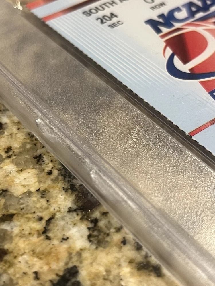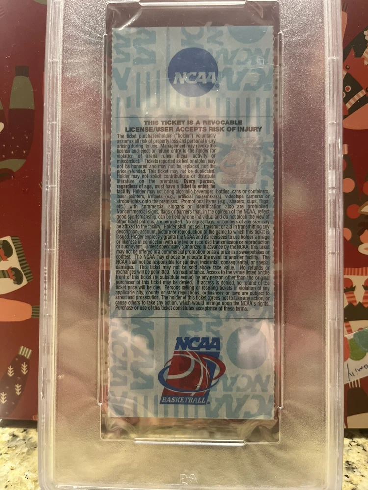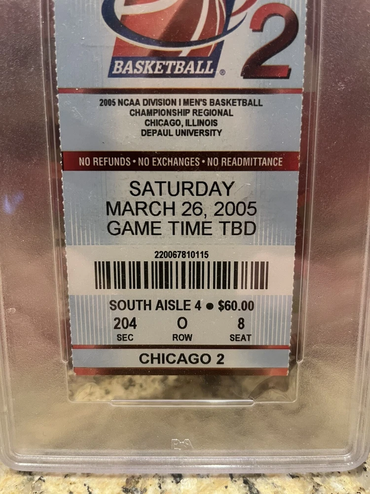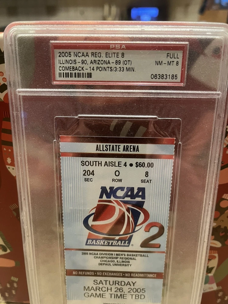 Ticket from the Elite 8 game in which Illinois scored 14 points in 3:33 to force overtime where the Illini prevailed 90-89. One of the most exciting games of the tournament. Card is graded PSA 8 near mint. Slab has a couple scuff marks on the edge. Please see photos.