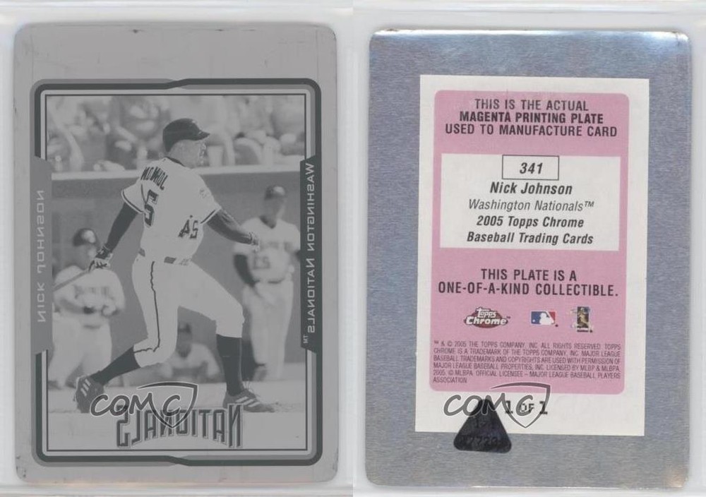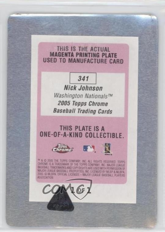 League:Major League Baseball (MLB)Series:Topps ChromePrint Run:1Set:2005 Topps ChromeSeason:2005Card Number:341Team:Washington NationalsPlayer/Athlete:Nick JohnsonParallel/Variety:Printing Plate MagentaManufacturer:ToppsFeatures:Serial Numbered, One of One, Base Set, Parallel/VarietySport:Baseballbrand:Topps