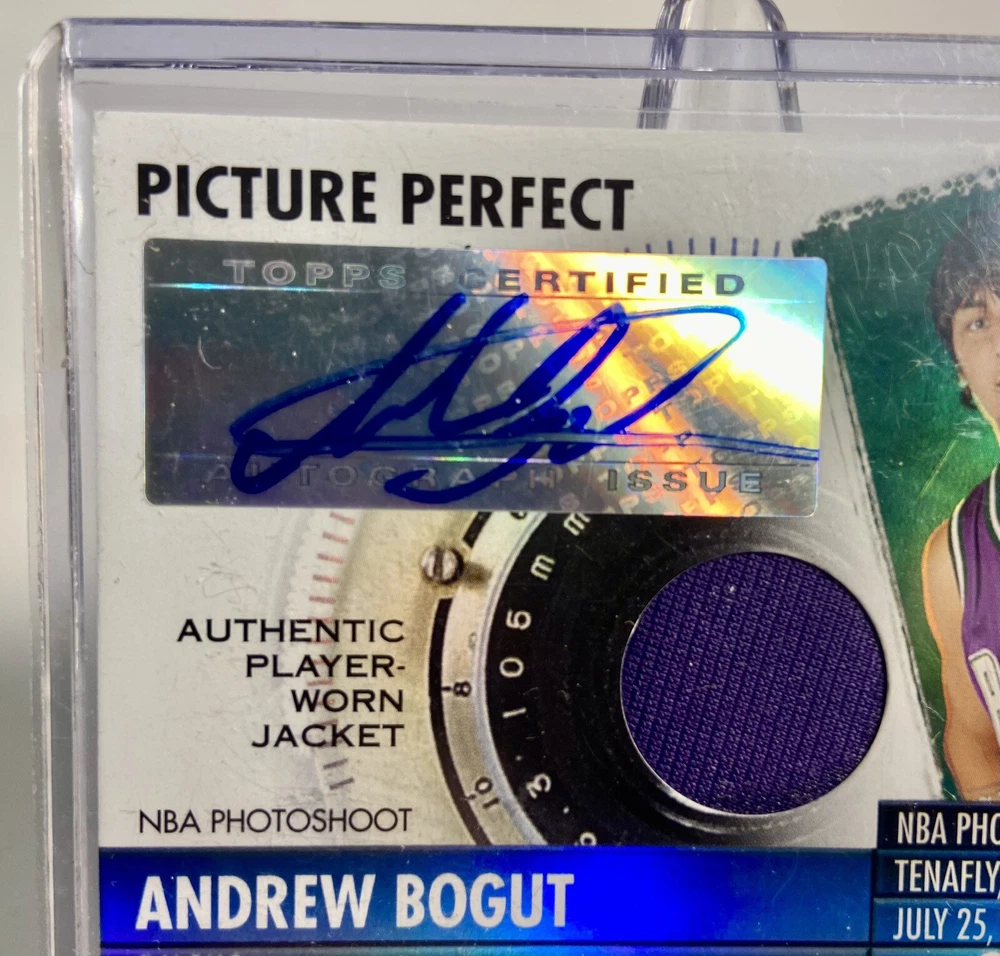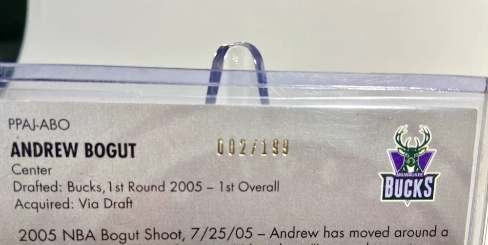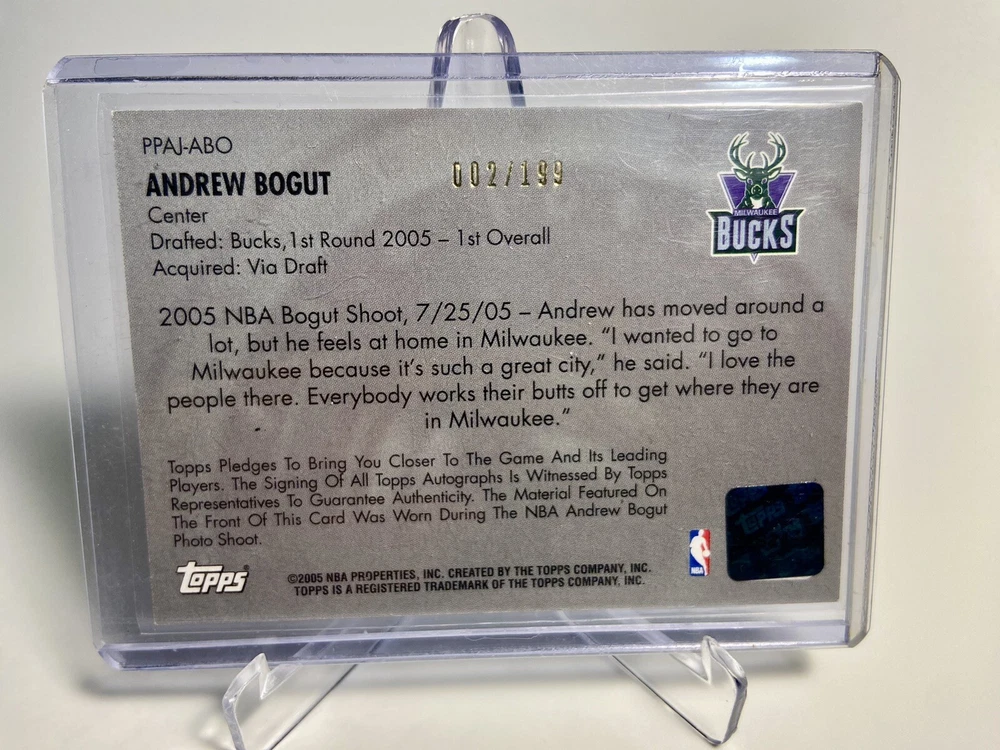 This 2005 Topps Picture Perfect Andrew Bogut Autograph RC is a rare find for any basketball card collector. With a print run of only 199, this card is signed by the player himself and features Bogut as a rookie. The card is part of the 2005 Topps set and has the card number PPAJ-ABO. The card is perfect for fans of the Milwaukee Bucks or the Golden State Warriors, as it includes both teams in Bogut's career. The autograph is a great addition to the card, making it a valuable item for any NBA or sports trading card enthusiast. Don't miss out on the chance to own this rare piece of sports memorabilia.