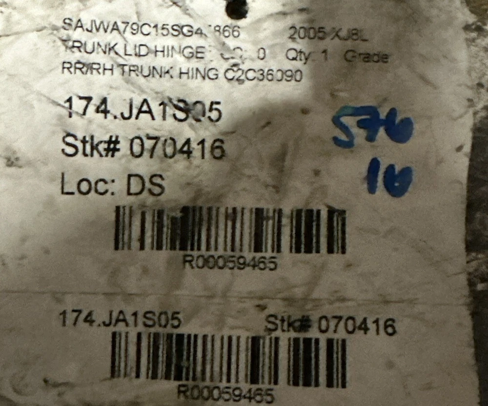 This is a Genuine OEM rear left trunk hinge for a 2005 JAGUAR XJ8L. It is a used part with a mileage of 103,000 and fits XJ8L models from 2005-2009. The part number is C2C36090, and it is designed for the liftgate of the vehicle. The item is in good condition and is ready for installation.