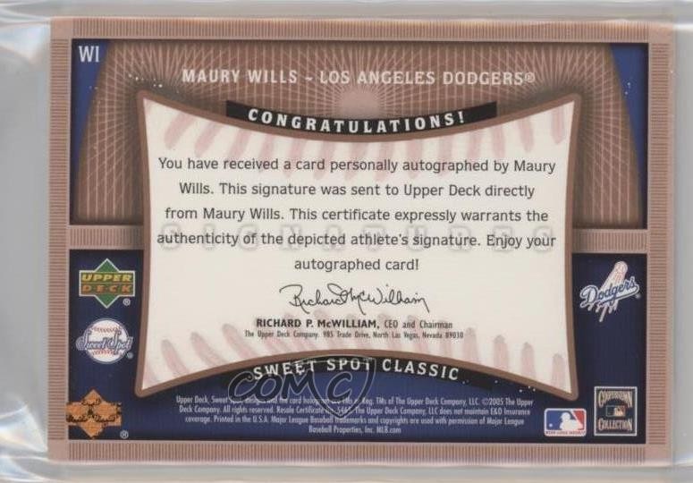 2005 Upper Deck Sweet Spot Classic - Sweet Spot Signatures #WI Maury Wills - Baseball Card - Featuring the Los Angeles Dodgers - Featuring Maury Wills Search for more: 2005 Upper Deck Sweet Spot Classic Search for more: 2005 Upper Deck Sweet Spot Classic - Sweet Spot Signatures View all of our Listings Auctions Buy It Now About Us Located in the beautiful Pacific Northwest, COMC (Check Out My Cards) is the world's largest consignment service for trading card singles. More than 10,000 people have used our consignment service to list over 50 million trading cards. Find out how we can help you consign your items on eBay by contacting us through eBay messaging. COMC -- "The Safe & Easy Way to Buy & Sell" Representative Image - Select Specific Item above to see image of actual item Representative Image - Select Specific Item above to see image of actual item Raw Condition for Modern Cards Unless otherwise noted, raw modern cards are listed in Near Mint-Mint condition or better. A NM-MT card appears to be Mint at first glance, but upon closer inspection, may exhibit some of the following: minor print defects (e.g. roller marks, print line, dimple), minor scratches, slight edge wear, and slight corner wear. Centering is clearly visible in the images provided and does not factor into our condition assessment. Raw Condition for Vintage Cards Unless otherwise noted, raw vintage cards are listed in Excellent condition or better. An EX card may exhibit some of the following: minor rounding of corners, surface wear, print defects, light scratches, and slight edge wear/chipping. Centering is clearly visible in the images provided and does not factor into our condition assessment. Domestic Shipping Combined shipping for multiple items is available. To receive combined shipping, please ensure all desired items are in your eBay shopping cart before proceeding to checkout. eBay limits orders to 40 items per order. We automatically combine multiple orders placed on the same day. If you place multiple orders on the same day, please contact us to request a refund of applicable shipping costs. Signature confirmation may be required on invoices over $400. All cards are protected and shipped securely. International Shipping COMC offers eBay's International Shipping (EIS) for international orders under $2,500* (see country exceptions below). All duties and import fees are paid at checkout; in the rare event that there are additional import fees upon delivery, these are borne by the buyer. EIS packages route through a shipping hub in Erlanger, KY before shipping to their final destination. Please note that EIS does not allow for combined shipments. The shipping rates are determined by eBay and cannot be adjusted. *Maximum sale price exceptions: Colombia, Kuwait ($2,000); Taiwan ($1,539); Chile, Costa Rica, Guatemala, Honduras, Trinidad and Tobago ($1,000); Antigua and Barbuda, Aruba, Belize, Dominica, Grenada, Philippines, Saint Kitts and Nevis, Saint Lucia, Montserrat, Turks and Caicos Islands ($500); Dominican Republic, El Salvador ($200). Please request a shipping quote through eBay messaging for orders that exceed the maximum sale price supported by eBay's International Shipping. You will be responsible for all duties and import fees for international orders shipped outside the EIS. All cards are protected and shipped securely. Payment COMC does not accept offers on our cards through our eBay storefront. COMC utilizes eBay’s managed payments system. If you are experiencing difficulties making a payment, please contact eBay for assistance. Return Policy Returns are only accepted on the rare occasion the item is not as described. If you are making a return, please initiate the return process through eBay so a mailing label can be provided for you. Prior to listing, our expert team carefully assessed this item to represent it accurately. Please review the description and high-definition images prior to purchasing to ensure this item meets your satisfaction. We welcome you to contact us if you have further questions about this item. Trust and Integrity COMC carefully assesses each item consigned to us to prevent fraudulent items from entering the marketplace. If you believe an item offered on COMC may be fraudulent, please contact us with details so we can investigate the issue. Items we determine are outside our supported items policy may be removed. Last Modified: 6/3/2025 5:07:46 AM PDT