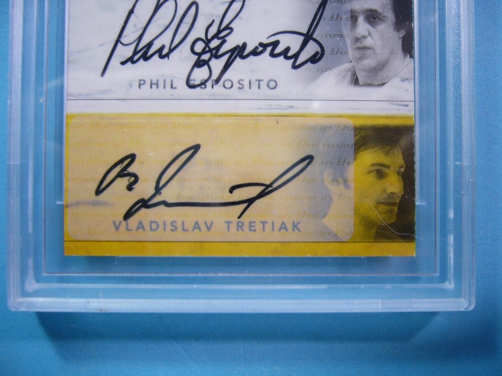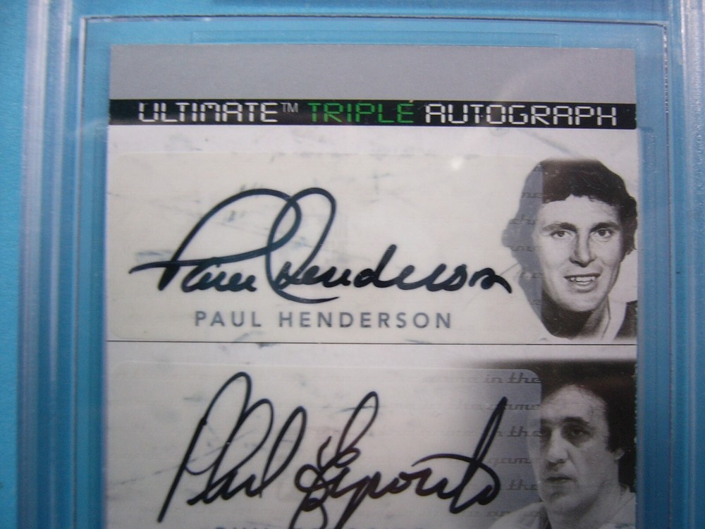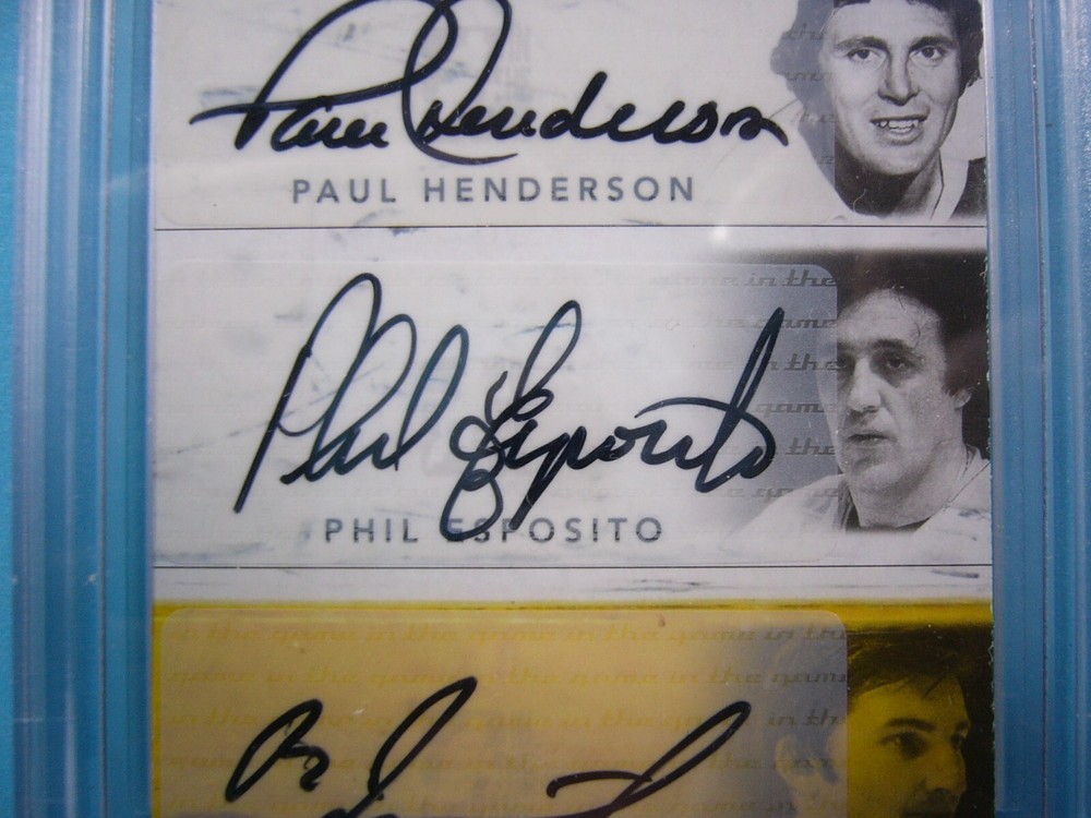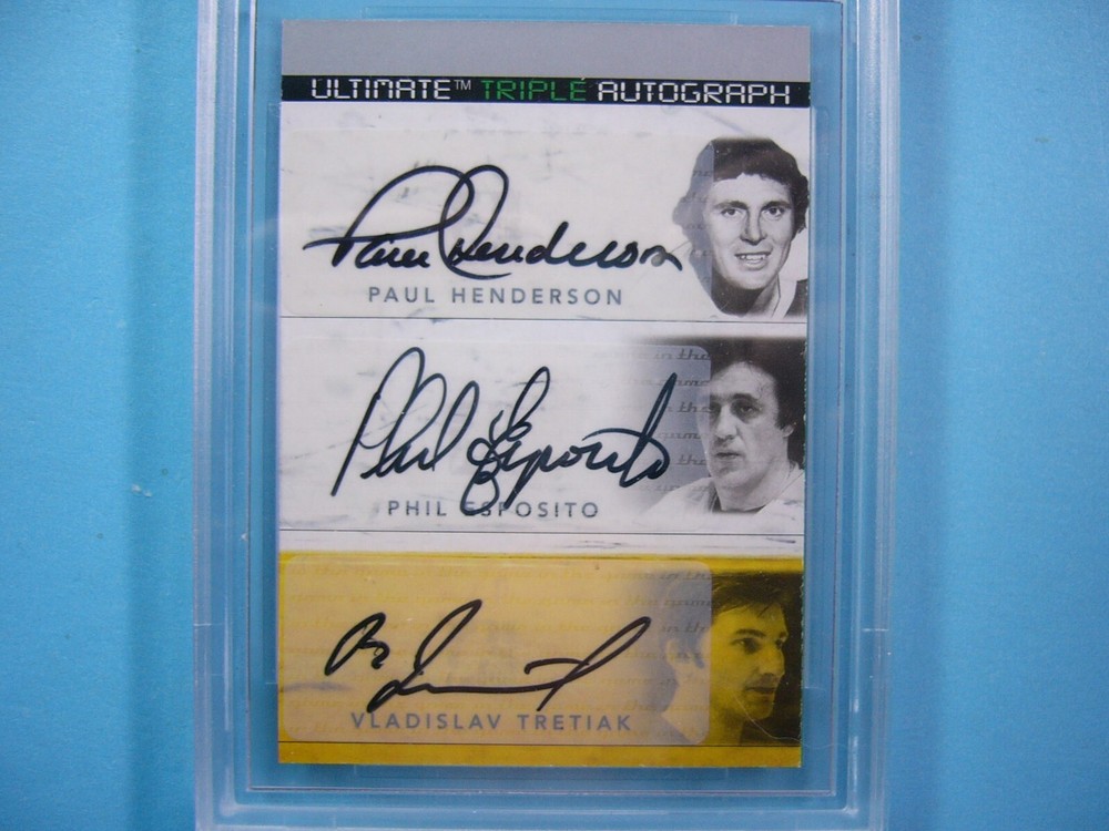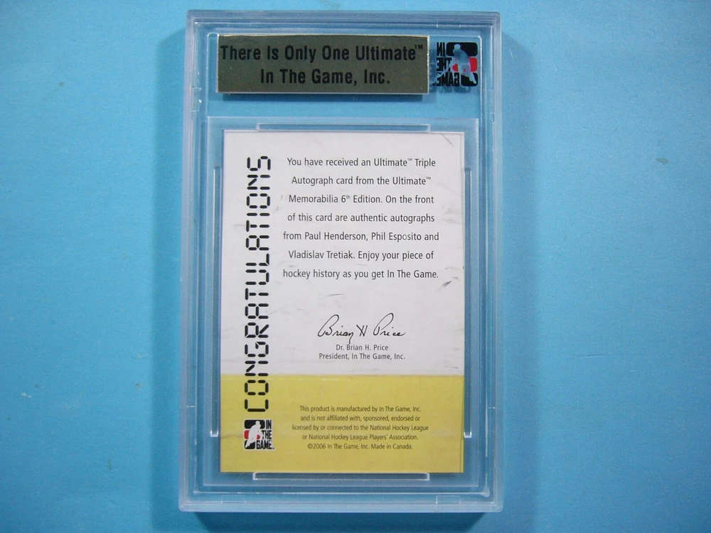 YOU ARE BIDDING ON A 2005/06 IN THE GAME ITG NHL HOCKEY CARD #NNO PAUL HENDERSON / PHIL ESPOSITO / VLADISLAV TRETIAK ALL PLAYERS PLAYED IN THE FAMOUS 1972 ICE HOCKEY SERIES CANADA VERSUS THE USSR / RUSSIA EXTREME LIMITED EDITION NUMBERED #06/09 A VERY SHARP CARD THAT ON FRONT SHOWS THREE 100% ORIGINAL & AUTHENTIC AUTOGRAPHS OF PLAYERS NOTED ABOVE. AUTOGRAPH IS CERTIFIED BY IN THE GAME AS NOTED ON BACK SIDE OF CARD. CARD ITSELF IS IN AS NEW MINT CONDITION. CORNERS ARE SHARP. ABSOLUTELY NO CREASES, BENDS OR WRINKLES. SEE SCANS FOR FURTHER CONDITION OF CARD AND CLOSER LOOK AT PLAYER SIGNATURES. GREAT COLOUR & GLOSS--A SUPER SHARP, CLEAN & ATTRACTIVE HIGH VALUE & HIGHLY COLLECITBLE AUTOGRAPHED CARD FROM THIS LIMITED IN THE GAME HOCKEY ISSUE!!! THANK YOU FOR LOOKING AND GOOD LUCK!!! -------------------------------------------------------------------------------------------------------------------------------- SHIPPING WITH TRACKING & INSURANCE WITHIN CANADA IS $15.00, TO THE UNITED STATES $20.00 AND INTERNATIONALLY $90.00 (EVERYWHERE ELSE). ITEM WILL BE CAREFULLY PACKAGED SO AS NOT TO GET DAMAGED DURING SHIPPING. I DO COMBINE SHIPPING ON MULTIPLE PURCHASES--ONLY 50 CENTS PER ADDITIONAL GRADED CARD OR ONLY 20 CENTS MORE PER ADDITIONAL SINGLE UNGRADED PHOTO OR CARD. TAKE A LOOK AT MY OTHER AUCTIONS AND SAVE ON SHIPPING!!!