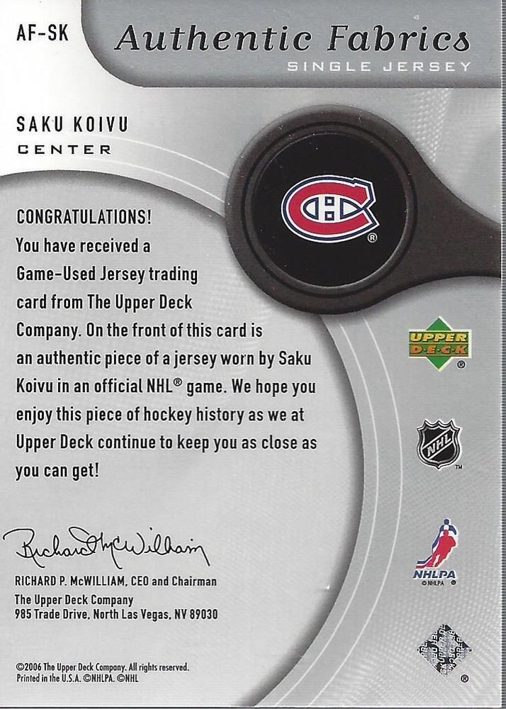 Welcome to our eBay store. Check out all our eBay items and check back often as we will be adding new cards daily. We ship each day so your order will be shipped promptly. We use top loaders or plastic boxes shipped in padded envelopes or cardboard boxes - whatever is appropriate. Pictures: Many of our pictures are stock photos. If you need to see a scan of the exact card you will receive, please email us before buying. If a card is serial numbered, we are not selling a specific serial number, unless the exact serial number is listed in the title. If our pictures does not match the description, the description is probably correct and photo incorrect - please let us know so we can get it fixed. USA shipping on singles is a flat fee - you can buy as many singles as you want for the one fee (does not include sets, boxes, or lots as these go by weight and your location). International shipping on singles is a FLAT fee - you can buy as many singles as you want for the one shipping fee (does not include sets, boxes, or lots as these go by weight and location). To get combined shipping, all cards must be paid for in 1 payment. You may have to wait to get a combined invoice if it did not combine automatically. We send out invoices each morning or ASAP upon request. Our retail store hours are 10am to 6pm, Central Time, Monday through Saturday. We answer your email during that time ASAP. 2005-06 SP Game Used Authentic Fabrics #AFSK Saku Koivu Jersey - NM-MT Front Back Sport: Hockey Set: 2005-06 SP Game Used Authentic Fabrics Year: 2005 Item#: AFSK Player: Saku Koivu Team: Montreal Canadiens Attributes: Memorabilia Brand: SP Game Used Manufacturer: Upper Deck Co. Grading Company: Raw Grade SetType: Insert Item Condition: Near Mint/Mint 2014 Beckett Collectibles, LLC. All Rights Reserved Powered by: