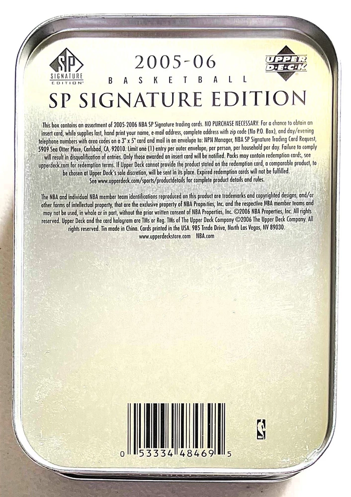 2005-06 SP Signature Edition Michael Jordan Artwork/Facsimile Autograph Empty Metal Tin (I also have the 2006-07 SP Signature Edition Empty Tin for Sale) Item has been stored in a Non-Smoking, Smoke Free Environment. Please let me know if you have any questions. The pictures of the card is the actual card up for sale. Card will be carefully and securely packed for shipping. Please Check out my other Auctions and Feedback and Bid with Confidence. Payment is Due No Later Than Four (4) Days after the Purchase or Auction Ends. Free Shipping Important - Please Read this Section Cards are mailed the next business day (in some rare instances, two business days) after payment is received. Card is being sent from Hawaii so it may take a day or two longer than you would normally expect. All Cards shipped to U.S. addresses are sent with Tracking and Delivery Confirmation. Customer Satisfaction is very important to me; please contact me if you have any questions after receiving your item. Feedback will be left after Buyers post feedback for this transaction. Thank you.