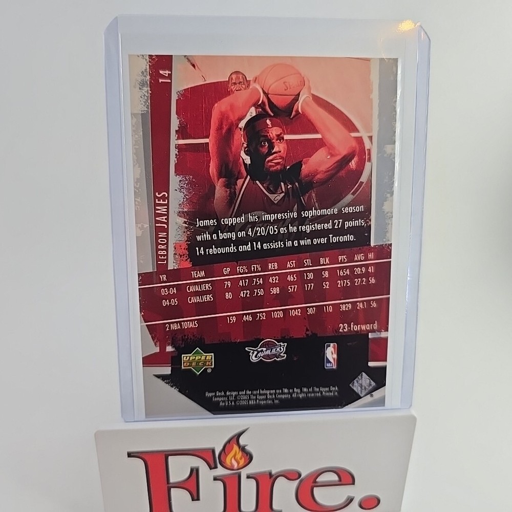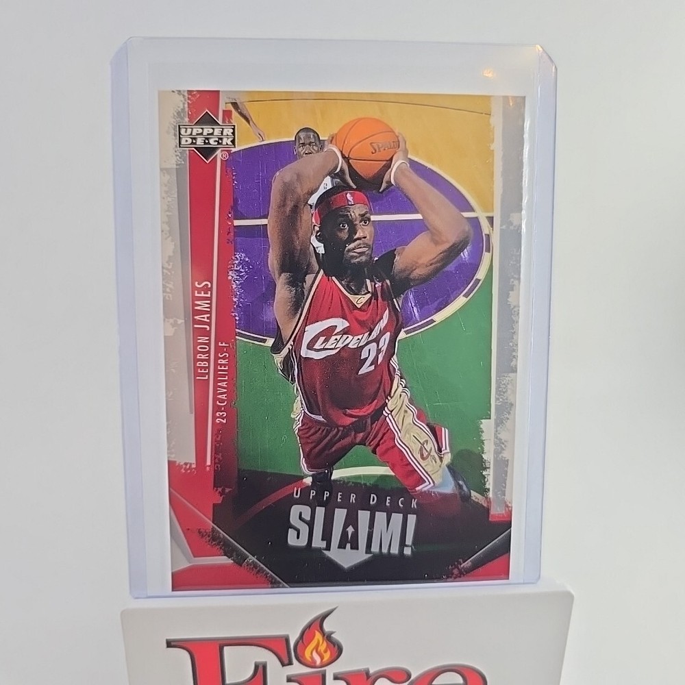 This is a 2005-06 Upper Deck Slam trading card featuring LeBron James of the Cleveland Cavaliers. It is part of the base set, card number 14, and is an original licensed print. The card is standard size and is from the National Basketball Association (NBA). It does not have an autograph and is not a vintage card. It is a sports trading card manufactured by Upper Deck. Thank you for your interest, don't let it get away bid today!