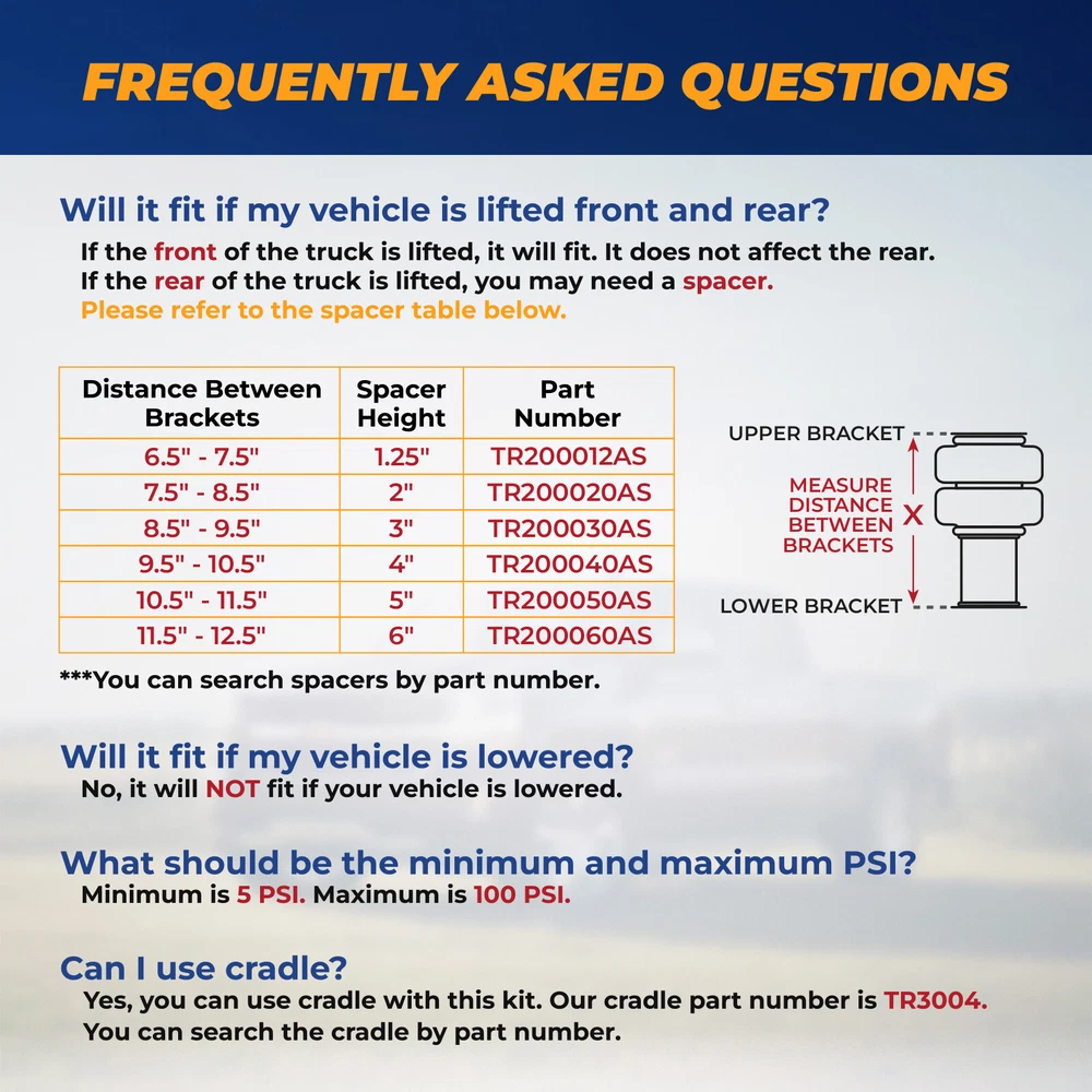 Aftermarketus Ebay Air Spring Helper Suspension Kit for 2005-2007 Ford F250 F350 4WD - High-Quality Torque HD Air Spring Helper Suspension Kit - Kit includes 2 air springs, all brackets, installation manual, bolts and nuts. - Fits following vehicles: -2005-2007 Ford F250 F350 4WD - Easy to install. No need to drill. - Increase stability and improve ride quality - Keep your vehicle level when you are hauling a heavy load - Improve steering control and braking when you are hauling or towing - Reduce tire wear - Reduce strain on rear suspension - Air helper springs will not increase your vehicle's weight-carrying capacity. Do not exceed the manufacturer's recommended weight limit. Replaces Firestone Ride-Rite: 2400 Specifications Load-leveling capacity : 5000 lbs Adjustable air pressure : 5 psi to 100 psi In-Bed Hitch Compatible : Yes Returns Payment Shipping Refund About Us & Feedback - Buyer will be charged 10% restocking fee after 30 day of the purchase for any unused returned item. - All Items must be returned with all original contents and components with prior authorization. - Return shipping shall be the responsibility of the buyer. We pay the shipping to send replacement. - In case of damaged parcel: * Carrier might damage items during shipping. * Please inspect the package well before accepting the shipment from the carrier. * To report a damage parcel, please contact us. * We will follow up and file a "damage claim" with the carrier. * All shipping, packaging materials and boxes must be saved. * Carriers will pickup the damaged item for inspection. - We accept PayPal and only ship to a confirmed address. - We accept E-Check through PayPal, Will ship after checks clears. (usually takes 7-10 days. - Items will ship out once the payment is made. - Checkout is expected within 3 days of auction close and payment within 4 days. - Unpaid auction wins will be forfeited after 4 days. - All orders are processed within 2 business day of receipt of payment. - The tracking number will be sent to you via e-mail when items are shipped. - Local pick up is available. Please email for arrangements. - Only ship to the confirmed address provided by PayPal. Please make sure your address in PayPal matches the address you would like us to ship to. - Address changing must be confirmed by our customer service before payment. - We DO NOT ship to Hawaii, Alaska, APO, FPO, and Puerto Rico. - Shipping fees and return fees are not refundable. Aftermarket US offers a Warranty for US customers on Torque Parts Truck & Trailer Air Springs, Air Brake Components, Wheel Seals. We warranty our rolling lobe (reversible sleeve) and convoluted air springs for semi-trucks and trailers for a limited lifetime. Every other product that we offer including convoluted air springs for pickup trucks, our cabin (sleeper) air springs, air brake components, and wheel seals are warrantied for one (1) year unlimited miles. Torque Parts is confident that you will be 100% satisfied with your product that we offer a 30-Day Return Policy on unused and uninstalled products. Improper use or installation is not a manufacturers defect. Please see the Torque Parts warranty page for more details about Limited Lifetime Warranty details. Aftermarket US air suspension products are warranted to be free from defects in materials or workmanship for the warranty period from the date of purchase. Within this period, Aftermarket US will, at its sole option, repair or replace any components that fail in normal use. Such repairs or replacements will be made at no charge to the customer for parts, provided that the customer shall be responsible for any transportation and installation costs. This warranty does not apply to: (I) cosmetic damage, such as scratches, nicks and dents; (II) normal wear and tear, unless product damage has occurred due to a defect in materials or workmanship; (III) damage caused by accident, abuse, misuse, water, flood, fire, or other acts of nature or external causes; (IV) damage caused by improper installation; (V) damage to a product that has been modified or altered without the written permission of Aftermarket US Inc.; or (VI) damage to a product that has been installed on a vehicle suspension that been modified or altered. If the unit sent in is still under its original warranty, then the new warranty is 90 days or to the end of the original warranty, depending upon which is longer. THE WARRANTIES AND REMEDIES CONTAINED HEREIN ARE EXCLUSIVE AND IN LIEU OF ALL OTHER WARRANTIES EXPRESSED, IMPLIED, OR STATUTORY, INCLUDING ANY LIABILITY ARISING UNDER ANY WARRANTY OF MERCHANTABILITY OR FITNESS FOR A PARTICULAR PURPOSE, STATUTORY OR OTHERWISE. THIS WARRANTY GIVES YOU SPECIFIC LEGAL RIGHTS, WHICH MAY VARY BY JURISDICTION. IN NO EVENT SHALL Aftermarket US, INC. BE LIABLE FOR ANY INCIDENTAL, SPECIAL, INDIRECT, OR CONSEQUENTIAL DAMAGES, WHETHER RESULTING FROM THE USE, MISUSE, OR INABILITY TO USE THIS PRODUCT OR FROM DEFECTS IN THE PRODUCT. SOME JURISDICTIONS DO NOT ALLOW THE EXCLUSION OF INCIDENTAL OR CONSEQUENTIAL DAMAGES, SO THE ABOVE LIMITATIONS MAY NOT APPLY TO YOU. Aftermarket US retains the exclusive right to repair or replace (with a new or newly remanufactured replacement product) the product or offer a full refund of the purchase price at its sole discretion. SUCH REMEDY SHALL BE YOUR SOLE AND EXCLUSIVE REMEDY FOR ANY BREACH OF WARRANTY. To obtain warranty replacement, contact the vendor from which you purchased your Aftermarket US product. If purchased directly from Aftermarket US Inc. please contact Aftermarket US Technical Support for shipping instructions and an RMA tracking number. Securely pack the product and a copy of the original sales receipt, which is required as the proof of purchase for warranty repairs. Write the RMA tracking number clearly on the outside of the package. Send the product, freight charges prepaid, to Aftermarket US Inc. Products purchased through online part stores and auctions (this does not appl