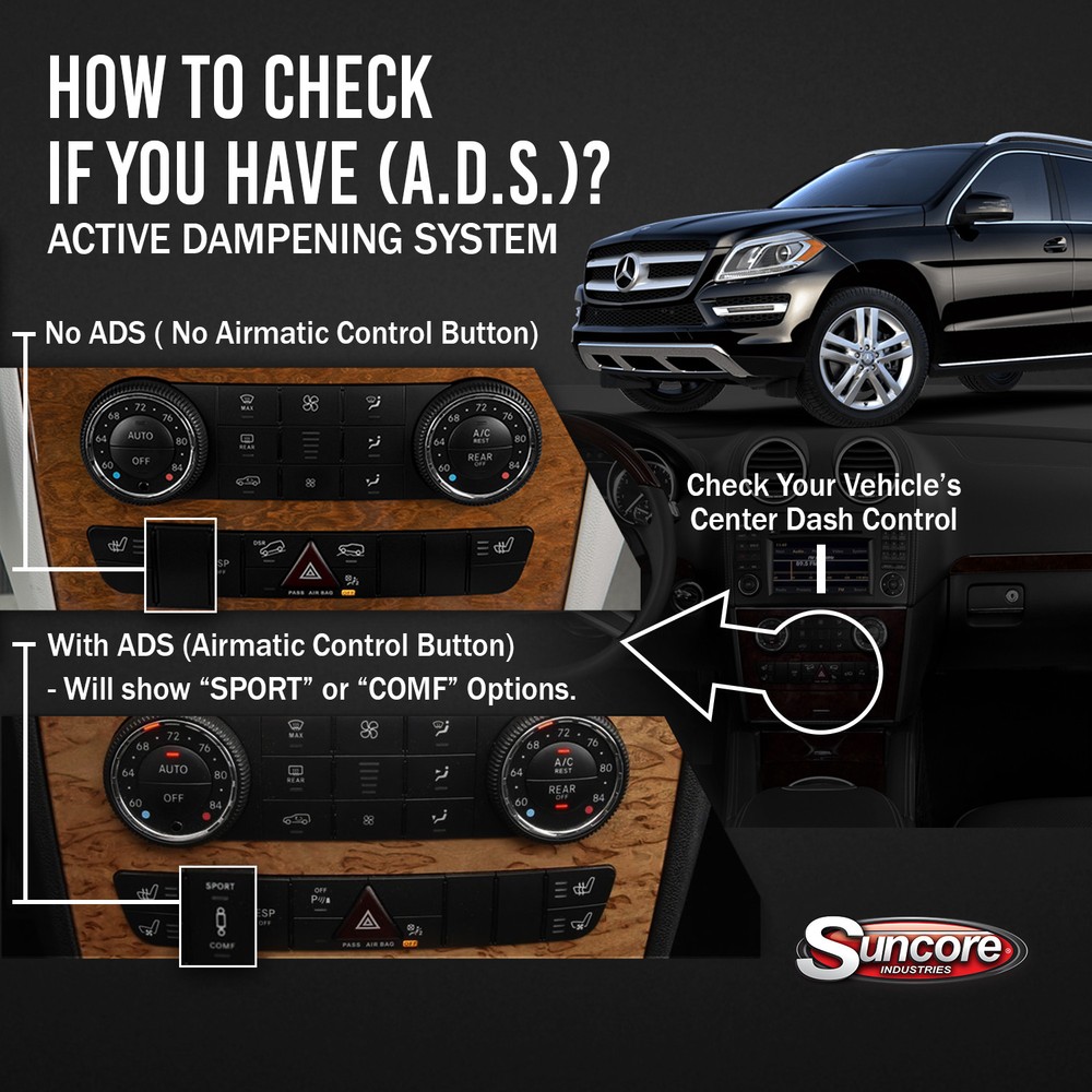 Air Suspension Specialist 2005-2007 Mercedes ML500 W164 Front Airmatic Suspension Air Struts with ADS Part # 129M-28-F-PAIR Condition: New Fits: 2005 - 2007 Mercedes-Benz ML500 KEY FEATURES: Saves You Money Compared To OEM/Dealer Prices Vehicle Specific Original Equipment Style Replacement Electronic Air Suspension Struts Kit Brand NEW Limited Lifetime Warranty IMPORTANT FITMENT NOTES (MUST READ): For W166 Chassis With Adaptive Dampening Suspension (ADS) INCLUDES (MUST READ): (2) Electronic Front Air Suspension Strut Assemblies PRODUCT DETAILS & FITMENT INTERCHANGE DATA SHIPPING & WARRANTY ABOUT Suncore’s Front Air Suspension Strut Kit 129M-28-F-PAIR for your 2005 - 2007 Mercedes-Benz ML500 is a direct replacement for your existing adaptive electronic air suspension, each strut is manufactured to meet optimal ride specifications. SPECIFICATIONS Part # 129M-28-F :: Front :: Air Suspension Strut Position Front WARNING CA Proposition 65 No DETAILED VEHICLE FITMENT Year Make Model Submodel Position Drive Cyl Liter Body Notes 2007 Mercedes-Benz ML500 Base Front AWD 8 5.0 Sport Utility For W166 Chassis; With Adaptive Dampening Suspension (ADS) 2006 Mercedes-Benz ML500 Base Front AWD 8 5.0 Sport Utility For W166 Chassis; With Adaptive Dampening Suspension (ADS) 2006 Mercedes-Benz ML500 Introduction Front AWD 8 5.0 Sport Utility For W166 Chassis; With Adaptive Dampening Suspension (ADS) 2006 Mercedes-Benz ML500 Premium Front AWD 8 5.0 Sport Utility For W166 Chassis; With Adaptive Dampening Suspension (ADS) 2005 Mercedes-Benz ML500 Base Front 4WD 8 5.0 Sport Utility For W166 Chassis; With Adaptive Dampening Suspension (ADS) 2005 Mercedes-Benz ML500 Special Edition Front AWD 8 5.0 Sport Utility For W166 Chassis; With Adaptive Dampening Suspension (ADS) INTERCHANGE Part Number Competitor Brand Competitor Part Number 129M-28-F Mercedes-Benz 1643204413 129M-28-F Mercedes-Benz 1643205913 129M-28-F Mercedes-Benz 1643205813 129M-28-F Mercedes-Benz 1643204313 129M-28-F Mercedes-Benz 164320581339 129M-28-F Mercedes-Benz 164320591380 129M-28-F Mercedes-Benz 1643206013 129M-28-F Mercedes-Benz 1643204613 129M-28-F Mercedes-Benz 164320591339 129M-28-F Mercedes-Benz 164320581380 129M-28-F Mercedes-Benz 164320601380 129M-28-F Mercedes-Benz 164320601339 129M-28-F CARDONE New 4J-2005S 129M-28-F Dorman 949-850 129M-28-F Westar AS-7321 129M-28-F Arnott Industries AS-2792 Order Processing: Normal order processing can take between 1-3 business days (Monday-Friday).These days excludes weekends and holidays. Orders placed before 2:00pm EST typically begins processing the same day. Orders placed after 2:00 PM EST. on Friday will not ship until Monday or the following business day. Note: Remanufactured items may take longer as they are built to order and tested vigorously before packing and shipping. Shipping & Delivery: Suncore Industries offers free shipping on thousands of products. Our preferred shipping method is UPS Ground, however smaller items may be shipped USPS First Class or Priority. Delivery times will vary, and products may ship separately from different warehouses located across the United States. Depending on warehouse locations and shipping destination, delivery times can range from 2 to 6 business days. Note: Free shipping is eligible only to U.S. delivery addresses within the 48 states. We do not ship to P.O. Boxes and APO/FPO addresses. Expedited shipping options are available for select items. Some orders may require a signature confirmation at time of delivery. Warranty: Suncore Industries limited warranty covers against defects in material or workmanship from the date of purchase. A dated sales receipt must be included to show your product was purchased within the warranty period. Note: Warranty period varies depending on product, please see product listing for more information. We handle all manufacturer warranty claims on your behalf. Any product found to be defective within 30 days of purchase is eligible for a refund or replacement, however any product found to be defective after 30 days but beforethe warranty period has expired are only eligible for a replacement only. Replacement product does not renew the warranty period. When a product is found to be defective, Suncore Industries will cover the costs of shipping of the replacement part to the original purchaser. Warranty and UPS related claims may require authentication, but not limited to pictures, video, or shipment back to the manufacturer. Note: Do not dispose of defective parts until instructed. If the defective part is requested to be returned to the manufacturer, Suncore Industries will issue a call tag for the original purchaser to ship the product back. The original purchaser is responsible for packaging and delivery to a UPS driver or suitable UPS facility for return shipment. Failure to return the requested product will result in denial of current warranty claim. All returned products must be accompanied by an approved RMA number provided by Suncore Industries. No reimbursements will be given for delay, labor, mileage, car rental, or any other costs involved in installation or re-installation of any product in question. Suncore Industries was established in 2000 and have been a member of the Automotive Parts Rebuilders Association (APRA) ever since. Our mission began with rebuilding air suspension components and moved quickly into offering better solutions with conventional suspension conversion kits and newly manufactured OEM style replacement parts. Suncore's Air Struts are manufactured to the Original Equipment specifications to be a perfect replacement for the faulty air strut assemblies in your vehicle. As an air spring installed over a dampener, Air Struts or shocks give you that comfortable ride while providing structural support for your vehicle and its load. Inspect and maintained your suspension at regular intervals to ensure your air suspension is working properly. When your vehicle begins to sag or isn't level, hand
