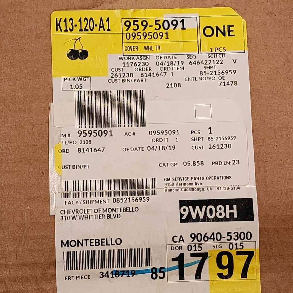Manufacturer Part Number:9595091Type:Hub CapCompatible Wheel Diameter:15 inGTIN:0615343144016mpn:9595091UPC:0615343144016Performance Part:NoVintage Part:NoColor:SilverMaterial:Plasticgtin13:0615343144016OE/OEM Part Number:9595091Number in Pack:1California Prop 65 Warning:WARNING: This product can expose you to chemicals including which is known to the State of California to cause cancer or birth defects or other reproductive harm. For more information, visit www.P65Warnings.ca.gov.Brand:ChevroletUniversal Fitment:No