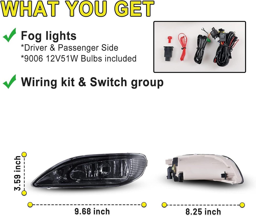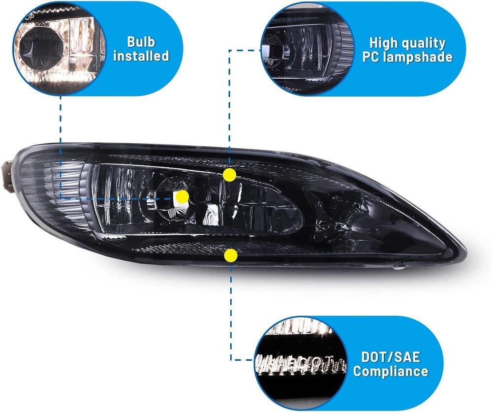 Number of Bulbs:2Color Temperature:3300KUniversal Fitment:NoBrand:WolfXFinish:Polished, SmoothModel:For 2002-2004 Toyota CAMRYInterchange Part Number:L:TO2592106; R:TO2593106;Bulb Shape Code:HB4 (9006)Features:DOT-Certified, SAE-Certified, Sealed AssemblyPerformance Part:YesOE/OEM Part Number:L:81220AA011 ; R:81210AA011Shipping Fee:Free shipping within 48 statesgtin13:Does not applyFitment Type:Direct ReplacementLens Color:SmokeCountry/Region of Manufacture:United StatesPlacement on Vehicle:Front, Left, Right, Driver, PassengerLighting Technology:HalogenUPC:Does not applyWattage:51 WItems Included:1 Pair Fog Lights, BulbsSold as a pair:Driver and passenger sideHousing Color:BlackMounting Style:ScrewsVintage Part:NoManufacturer Part Number:Front LampsManufacturer Warranty:1 YearCertifications:DOT,SAEType:Fog LightVoltage:12 VFast Shipping Time:Same day shipping before 1pm PST orderFitment 2:For 2002-2003 Toyota SOLARALight Color:Warm WhiteFitment 1:For 2005-2008 Toyota COROLLAReturn Shipping:Seller pays. Free return shipping within 48 states