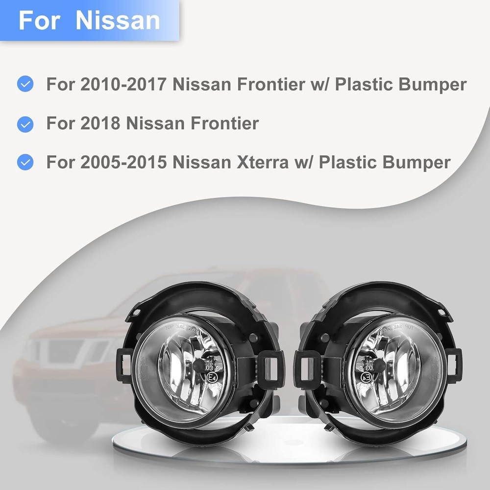 Store Categories Other Car Refrigerator Front Bumper Rear Bumper Fender Flares Inner Fenders Side Steps Running Board A-Pillar Light Mount Brackets Headlights Taillights Fog Lights LED Headlights LED Taillights LED Fog Lights Jeep Chevrolet Ford Toyota Dodge GMC Pair Fog Lights Bezels: https://www.ebay.com/itm/405204216250 About this item 🔵 【Exact OEM Fit & Easy Installation】Fog Light Assembly Fits For 2010-2019 Nissan Frontier w/ plastic bumper, 2005-2015 Nissan Xterra w/ plastic bumper. Fog lights come with pure PC cover, quick and easy Installation. 🔵 【Premium Quality】This Fog Lights are made of Special Materials which are Resistant to Water, Tough Shatterproof and Clear PC Lens, Dustproof, Shockproof, Rustproof, anti Corrosion, Long Lasting, and Durable. 100% Advanced chips add visibility crucial in Navigation Poor Weather Conditions, Including Rain And Snow, as Well as Dense Fog. Last more than 50,000 Hours. 🔵 【Package included】One pair of fog lights(driver and passenger side), with H11 12V55W Halogen Bulbs+Wiring Harness Kit + Switch. Allow you to see and be seen by oncoming drivers even through a thick fog. High intensity lamps provide exceptional illumination for increased driving safety. 🔵 【Guarantee & 24hrs Quick Reply】 - We Support return for undamaged, full non-defective fog light within60 days after receipt of goods and 1 Year WARRANTY for these fog lights. If any questions, please contact us directly, we will solve for you within 24hours. Our aim is to make you satisfy the parts and the service we provide for you. Perfect Fitment 🔵 For 2010-2019 Nissan Frontier w/ plastic bumper 🔵 For 2005-2015 Nissan Xterra w/ plastic bumper Specifications 🔵 Condition:100% Brand New 🔵 Material: ABS Plastic 🔵 Type: Front Fog Lamp 🔵 Light Source : Halogen 🔵 Bulb Type : H11 12V 55W ( Included 2 PCS ) 🔵 Color Finish : Black Housing+Clear Lens 🔵 Lens Material : Glass Lens 🔵 Switch Wiring Harness: Included 🔵 Certification: DOT/SAE Compliance 🔵 Replaces Original (OEM) Part # : R=L: 26150EA025 🔵 ABPA Partslink # : R=L: NI2590102 Package Included 🔵 1 Pair Fog Lights (Left & Right Side) 🔵 2 H11 Bulbs 🔵 Switch & Wiring Harness Kit Payment Delivery details Terms of sales About us Contact us Payment We accept PayPal, credit card , Apple Pay & Google Pay etc. Delivery details All items will be shipped within 1-3 business days after payment received, we will try our best to ship out as soon as we can, hope for your understanding. Please double confirm your address and contact information, which will help the delivery faster and more accurately. Note :buyers who purchase international products need to pay import tariffs!!! Terms of sales Professional installation is highly recommended. Any problem of the item please feel free to contact us first , please D o Not leave negative feedback before that, or simply return it within 60 Days in original condition. We will resolve it for you ASAP. About us Any questions please do not hesitate to contact us directly by eBay message . We will reply you within 24 hours asap, thanks for your understanding. Contact us Should you have any problem or require any further information please feel free to contact us . If you are satisfied with our product and service, please kindly leave us a positive feedback. Popular Categories On Mar 14, 2025 at 20:36:16 PDT, seller added the following information: