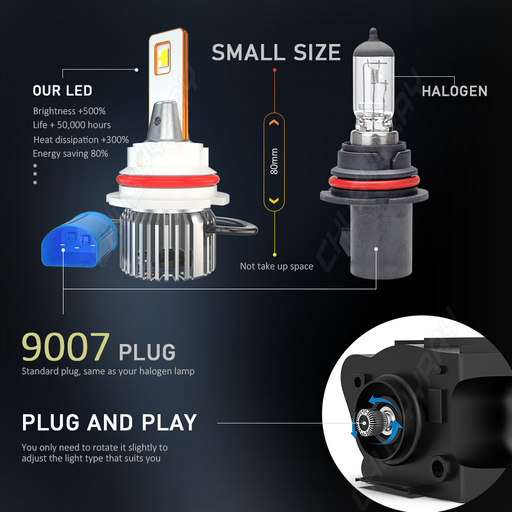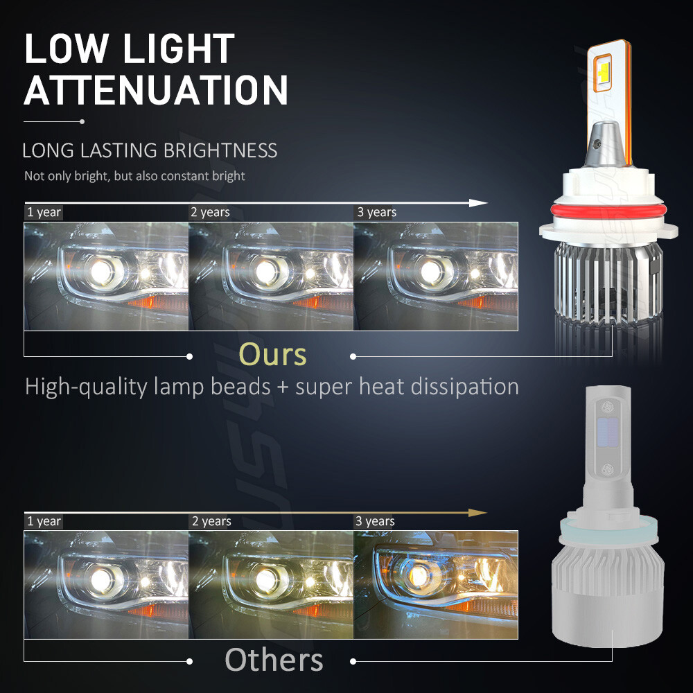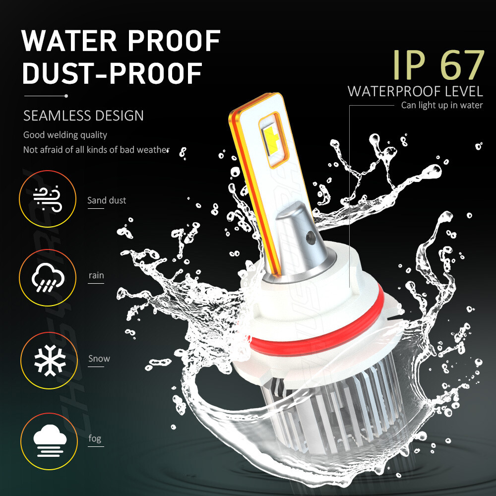 Product Parameters: Light source: 3570 Material: Aviation Aluminum Working Voltage: 9-23V Color temperature: 6000K Lumen: 8000LM Life: 50000 hours Working environment: -40℃~80℃ Waterproof grade: IP67 Product Performance: 1)SUPER BRIGHT 3570 LED CHIP 0.5mm thinnest LED spacing,the shorter the distance the better spotlight,super focused beam design,no dark spot. 2)ROTATABLE DESIGN Removable collar ring,you can now adjust the beam angle to a perfect one.Fit for 98% headlamp covers on market 3)COOLING SYSTEM,FOUR WAYS HEAT DISSIPATION Copper heat conduction;Evaporation from aviation aluminum;Polyhedral grid;Built-in turbo fan,silent and high speed. 4)IP67 WATERPROOF DESIGN For the most extreme conditions,with explosion-proof,shockproof,hign temperature hign pressure and other charateristics. 5)Small outer diameter, easy to install, high brightness, very concentrated, and fast heat dissipation. 6)Wider and further illumination areas than halogen lamp,300% brighter than traditional halogen lamps. 7)White light source, easy to accept by human eyes, will not feel tired Package Included: 2x LED 9007/HB5 headlight bulbs high beam 2x LED H11/H8/H9 foglight bulbs New and old packaging will be shipped randomly Notice: 1.The product must be installed by professionals. Please disconnect the car battery before installation. Please check the wiring after installation. 2.Please reserve enough space in the headlight housing for installtion and heat dissipation. All our products are manufactured under the strictest quality control. If the project is not functioning properly, please contact us by email first. If you have any questions, please contact us in time.