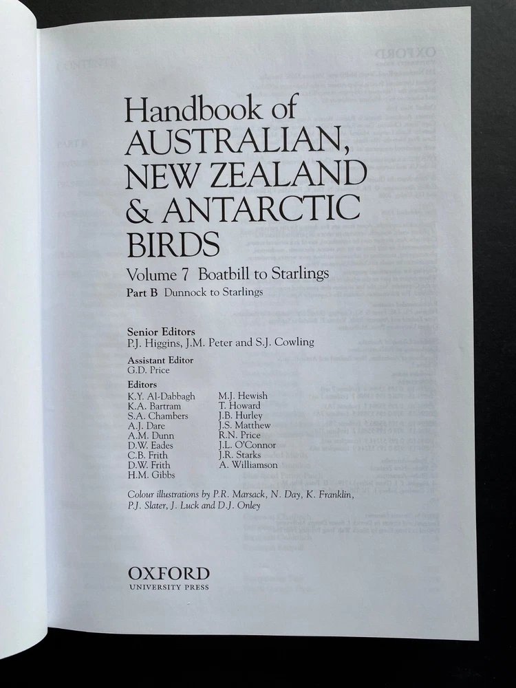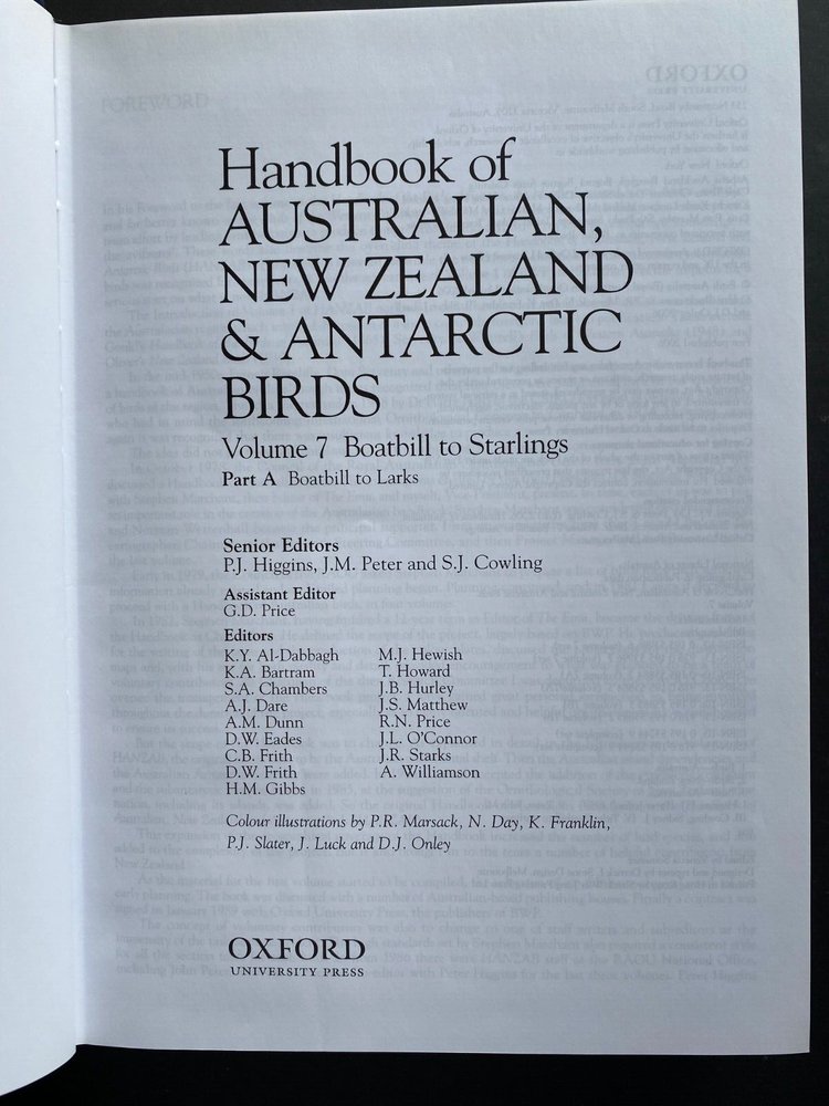 Sub-Subject: Australian, New Zealand and Antarctic Birds Character Family: Australian, New Zealand and Antarctic Birds Type: Book Subject: Ornithology Binding: Hardcover with dustjacket Author: Peter Higgins, et al., editors Original/Facsimile: Original Year Printed: 2006 Country of Origin: Australia Publisher: Oxford University Press Special Attributes: 1st Edition, Dust Jacket, Illustrated, Both volumes Original/Reproduction: Original Modified Item: Yes Language: English