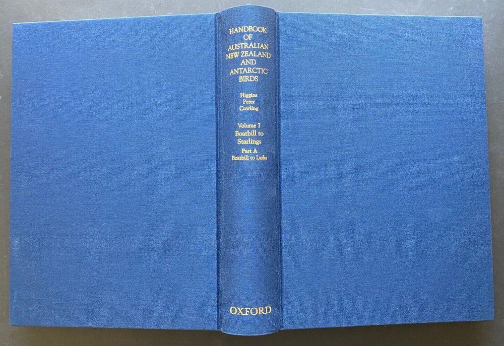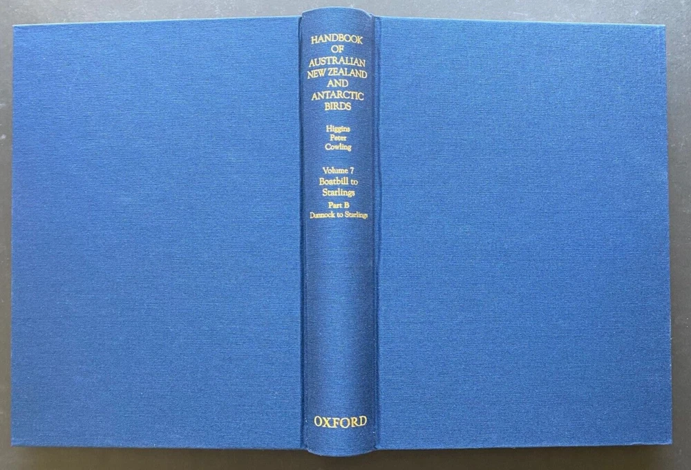 Express Shipping Worldwide is Free Handbook of Australian, New Zealand and Antarctic Birds: Boatbill To Starlings Volume 7A - Boatbill to Larks and Volume 7B - Dunnock to Starlings By Peter Higgins, et al., editors Published by Oxford University Press , Melbourne, 2006 Both volumes First Edition and both in brand new pristine condition, unread. In 2,200 pages with 54 colour plates plus numerous text illustrations, and many maps. The Dustjackets: There is no shelfwear. There is no foxing. There is no sunning to the dustjacket spine. There are no tears, chips, or creases. The Books: There is no shelfwear. There is no foxing. There are no previous owners' names or inscriptions. All of the plates are fresh, bright and crisp - pristine. There are no missing, creased, loose, stained or damaged pages. They are complete and original. Each species account includes sections on field identification, habitat, distribution and population, movements and migration, food, social organisation, social behavior, voice, breeding, plumage and morphology, and references. Volume seven completes coverage of the passerines (also known as the songbirds or perching birds) and provides detailed descriptions of 168 species, including the flycatchers, currawongs, riflebirds, ravens, bowerbirds, grass finches, swallows and white-eyes. The 54 colour plates are by renowned bird artists which depict all extant species in fine detail. Species of particular interest include the bowerbirds, the Australian finches, and the white-eyes, including the Silvereye. Each measures 20cm x 27cm x 5cm and weigh a significant 5 kgs unpacked. BOXED AND EXPRESS SHIPPED is Free Worldwide All items are securely and well packed. Thank you for viewing my item.