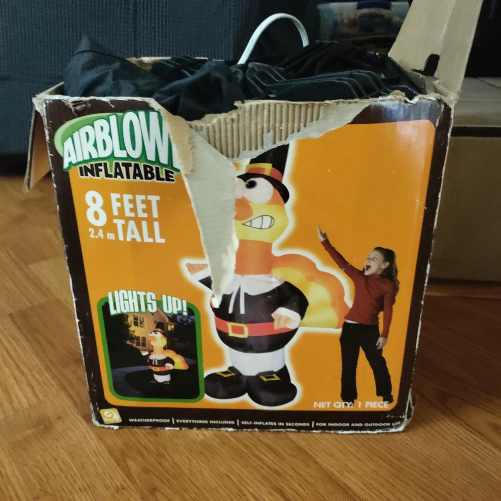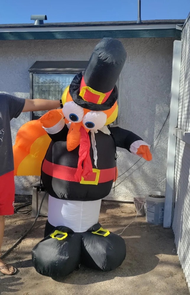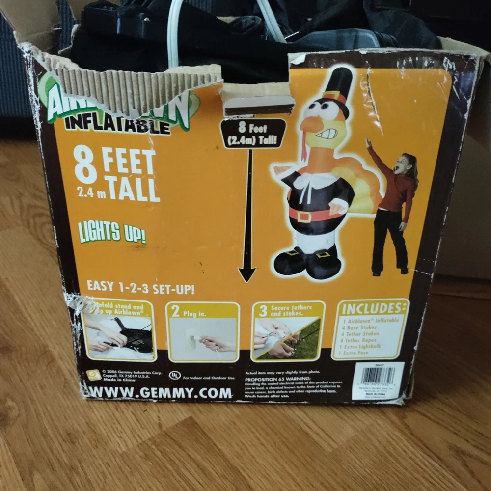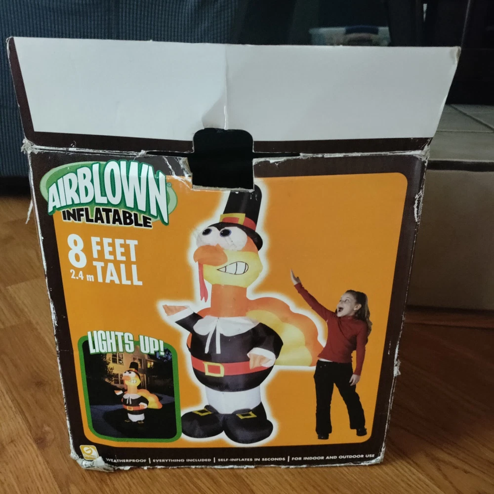 The inflatable doesn't stand straight and he bends at his neck. The box is damaged and doesn't have a top. There is a spot where the tail and the back of the turkey were supposed to be connected but looks like it came apart. Please see pictures. Lights up. Some of the clips to tie down the turkey are broken. USPS Ground Advantage and USPS Priority shipping available.
