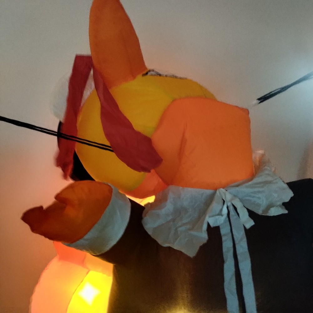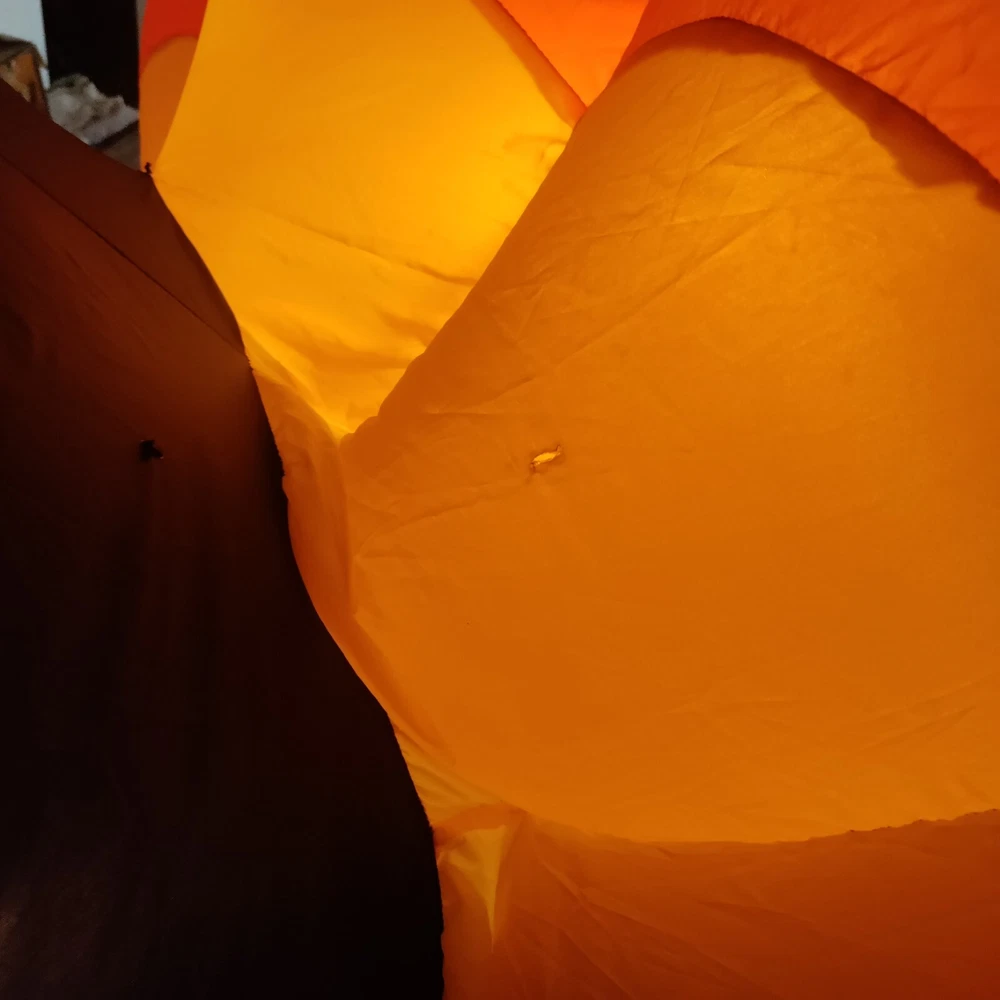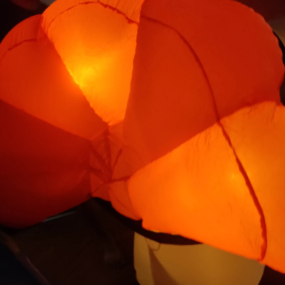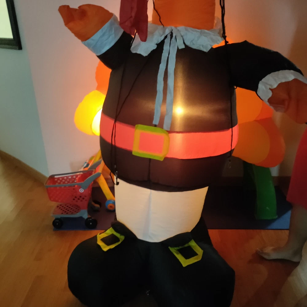 The inflatable doesn't stand straight and he bends at his neck. The box is damaged and doesn't have a top. There is a spot where the tail and the back of the turkey were supposed to be connected but looks like it came apart. Please see pictures. Lights up. Some of the clips to tie down the turkey are broken. USPS Ground Advantage and USPS Priority shipping available.