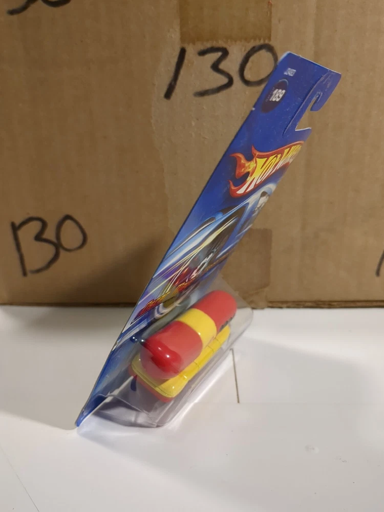 This 1:64 scale die-cast metal and plastic Hot Wheels car is a must-have for collectors and fans of the Oscar Mayer brand. The car features a red and yellow color scheme with gold 5 spoke wheels and comes in an unopened box. The vehicle is a Hot Wheels Mainline model from 2006 and is recommended for ages 3 and up. The car is part of the Die Cast Cars character family and was manufactured in Malaysia. It is a great addition to any collection and makes for a fun toy for boys and girls alike. Don't miss out on the opportunity to own this unique and rare Hot Wheels car. See pics for condition issues,,,dent on blister
