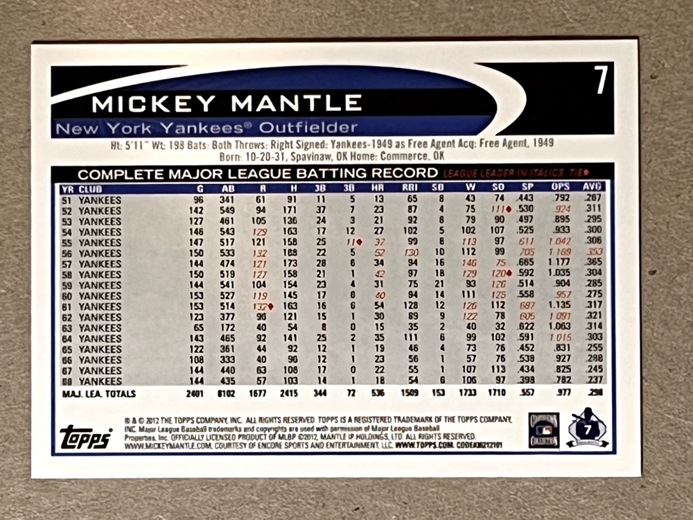 The product is a 2006 Topps Baseball Card featuring Mickey Mantle from the New York Yankees in the Major League (MLB). The card is part of the Base Set and is numbered as #7. Manufactured by Topps, this sports trading card captures a piece of baseball history with a focus on the legendary player Mickey Mantle. It is a sought-after item for collectors and fans of baseball memorabilia, especially those interested in iconic players like Mantle.