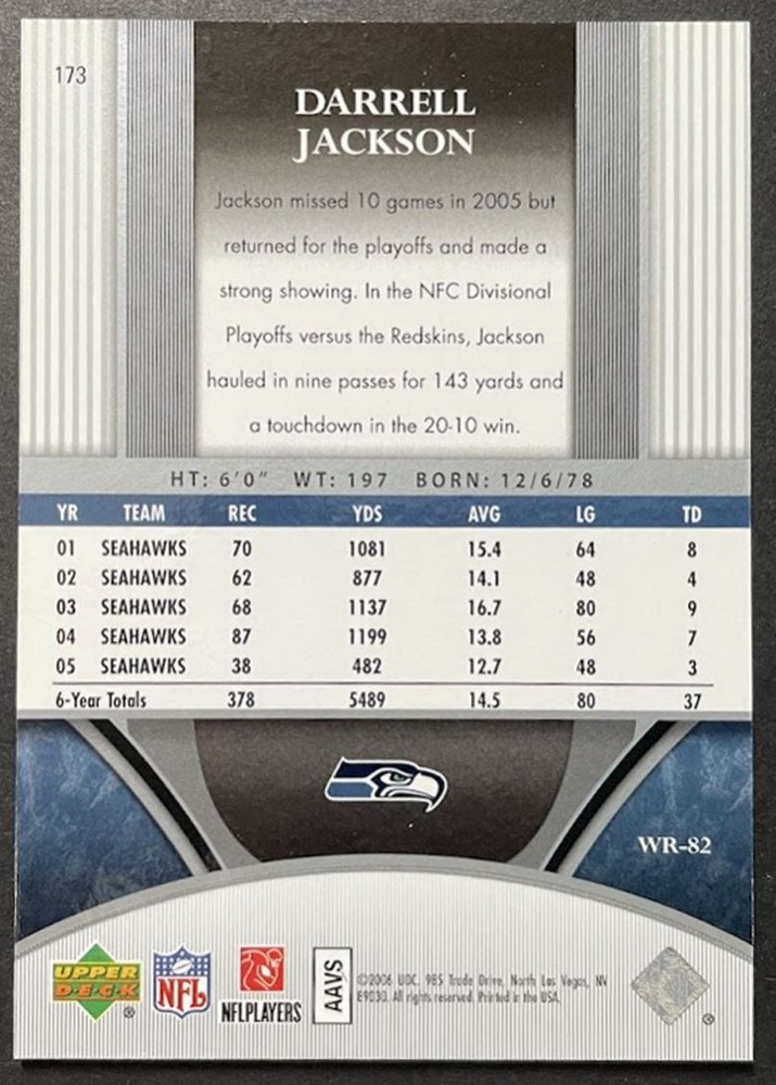 About Me Other Listings Feedback Add to Favorites Contact Me eBay Store Calgary Card Shop 2006 Upper Deck Ultimate Collection Darrell Jackson 463/525 Seattle Seahawks No stock photo / These are real scans or pictures Details Description: Darrell Jackson Category: Football Year: 2006 Product: Upper Deck Ultimate Collection Team: Seattle Seahawks Card Number: 173 Serial Number: 463/525 Dimensions: 3½" x 2½" SKU: FT B00001 R01 H (18) Shipping Shipping Canada: Lettermail or Registered Mail, Expedited Parcel Combined Shipping Free United States: USPS First Class Combined Shipping $0.50/each USPS First Class Listing By Kronocard trading cards software v2.8.2.3