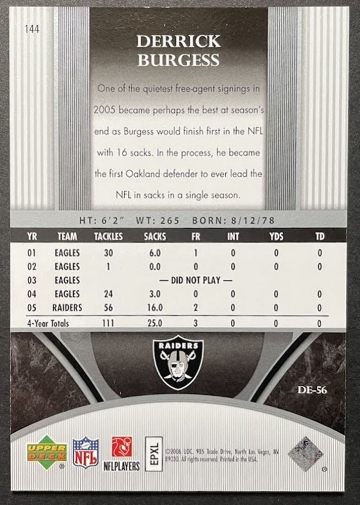 About Me Other Listings Feedback Add to Favorites Contact Me eBay Store Calgary Card Shop 2006 Upper Deck Ultimate Collection Derrick Burgess 433/525 Oakland Raiders #144 No stock photo / These are real scans or pictures Details Description: Derrick Burgess Category: Football Year: 2006 Product: Upper Deck Ultimate Collection Team: Oakland Raiders Card Number: 144 Serial Number: 433/525 Dimensions: 3½" x 2½" SKU: FT B00001 R01 H (6) Shipping Shipping Canada: Lettermail or Registered Mail, Expedited Parcel Combined Shipping Free United States: USPS First Class Combined Shipping $0.50/each USPS First Class Listing By Kronocard trading cards software v2.8.2.3